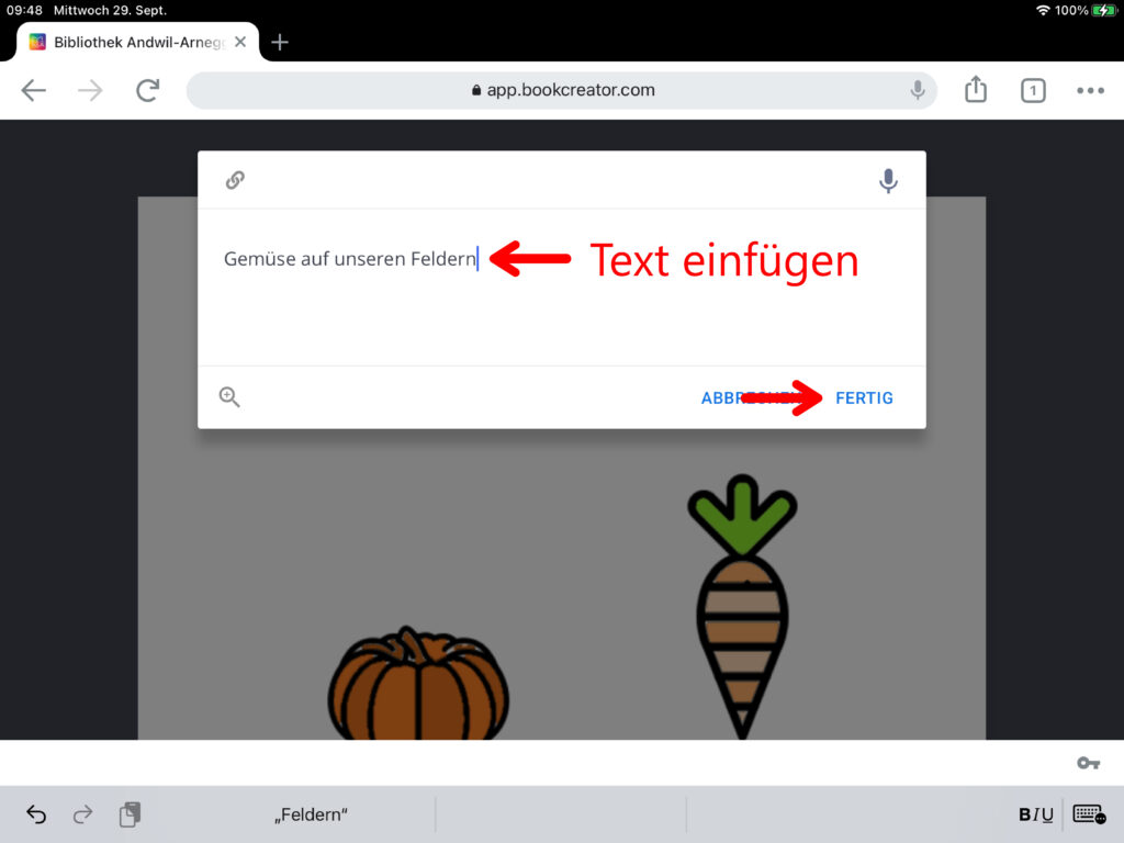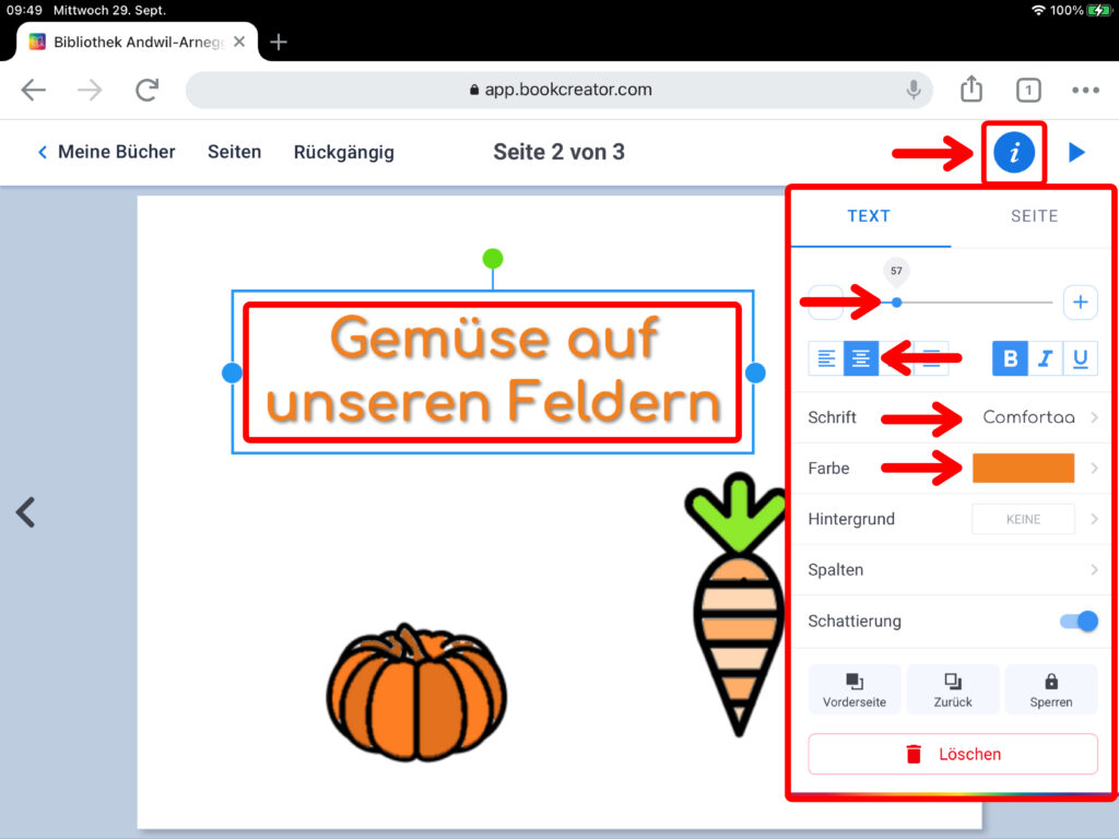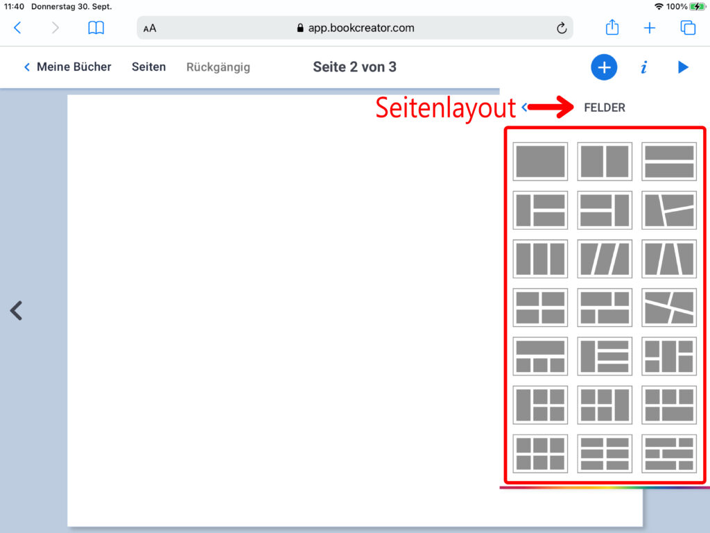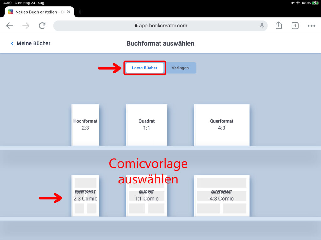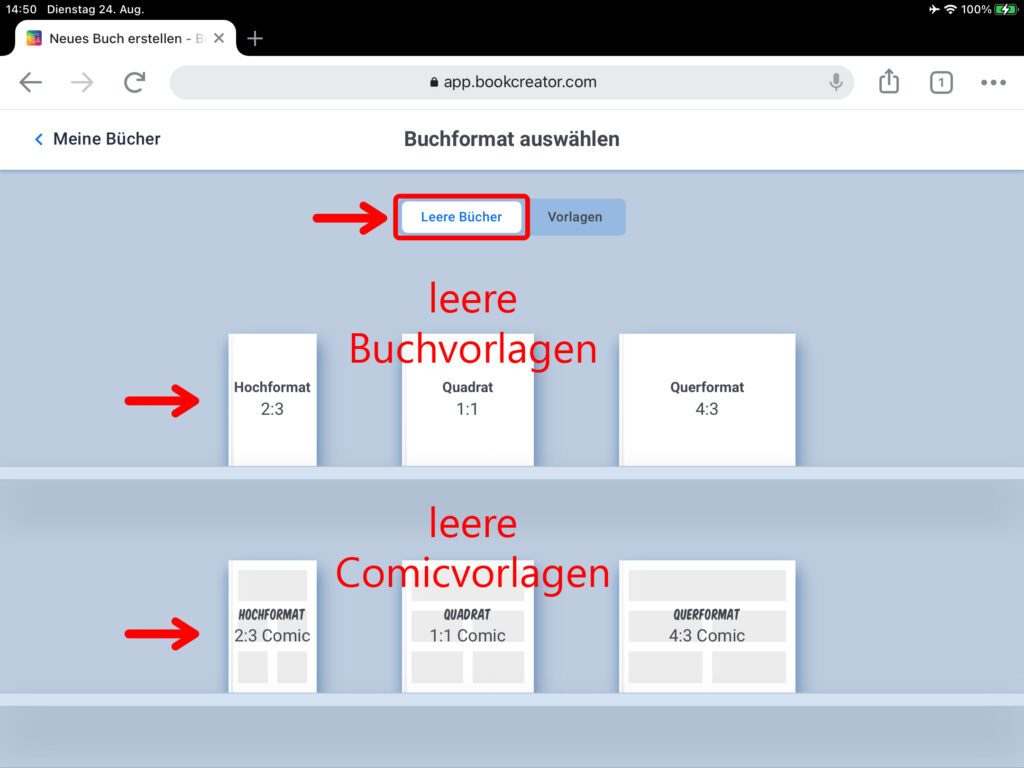 WICHTIG: Wenn mehrere Personen auf verschiedenen iPads an einem gemeinsamen Buch arbeiten, das am Ende zusammengefügt werden soll, muss zwingend das gleiche Format ausgewählt werden!