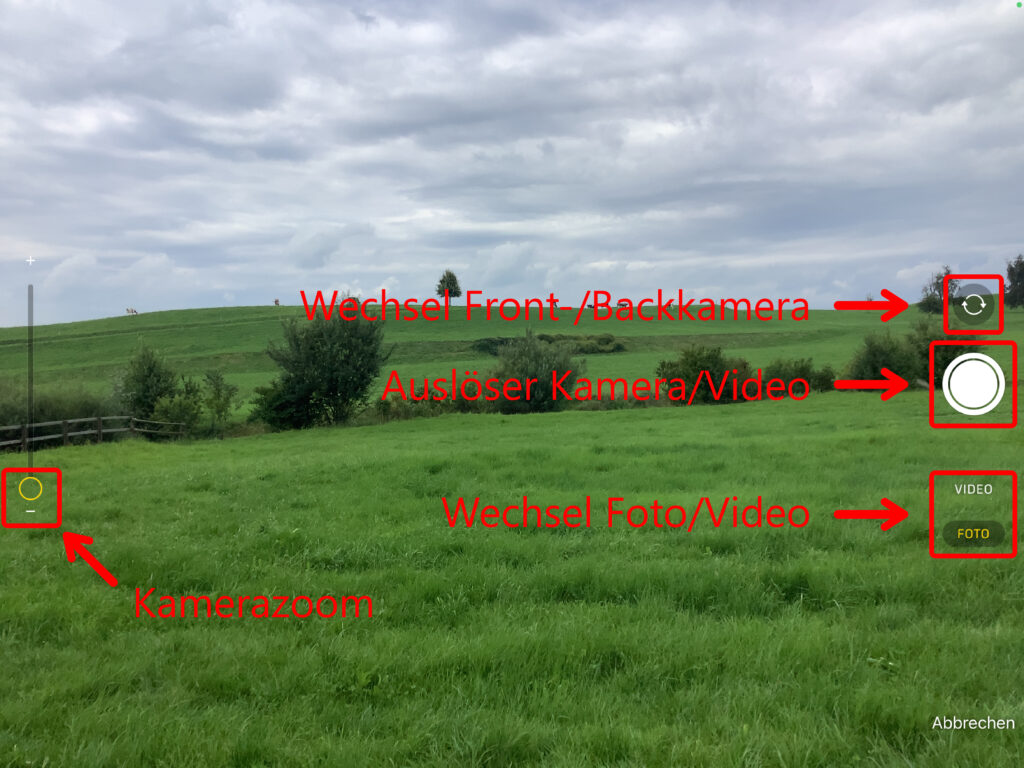 Klicke auf «Kamera», um Bilder und/oder Videos direkt zu erstellen und anschliessend einzufügen.