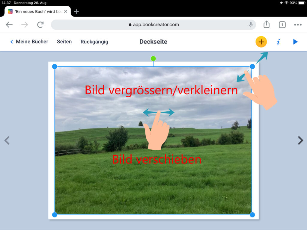 Hast du ein Buchformat gewählt, erscheint deine Deckseite. Diese kannst du nun frei gestalten. Sie ist die Titelseite (das Cover) deines E-Books.