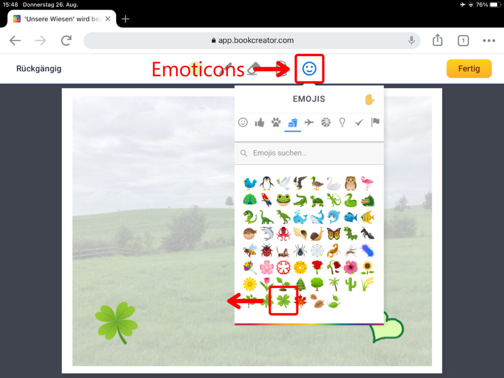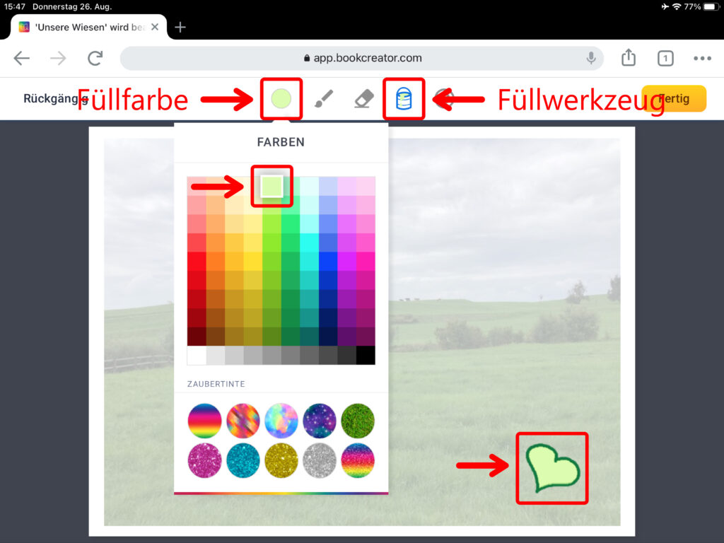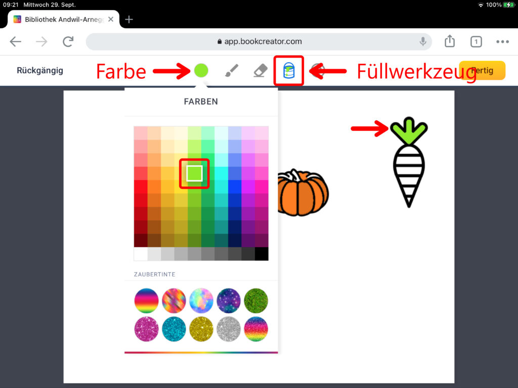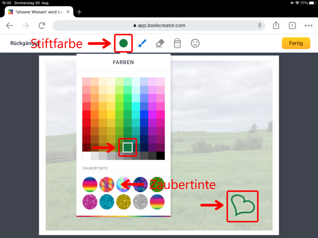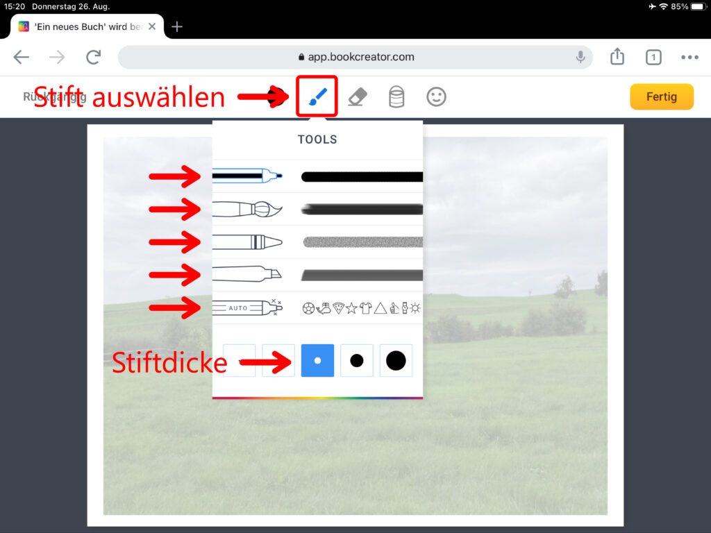 Nun hast du die Auswahl zwischen fünf verschiedenen Stiften. Wähle für eine normale Zeichnung den Filzstift aus. Im Auswahlfeld ganz unten kannst du die Dicke des Stiftes bestimmen. Klicke auf das Symbol mit dem runden Kreis, um die Stiftfarbe zu verändern. Du kannst unten im Feld «Zaubertinten» auch vorgegebene Muster wie zum Beispiel ein Wiesenmuster aussuchen. Mithilfe des Gummis lassen sich ausgewählte Bereiche wieder löschen. Den Eimer benutzt du, um begrenzte Flächen mit Farbe zu füllen. Über das Smiley-Symbol kannst du Emojis einfügen.