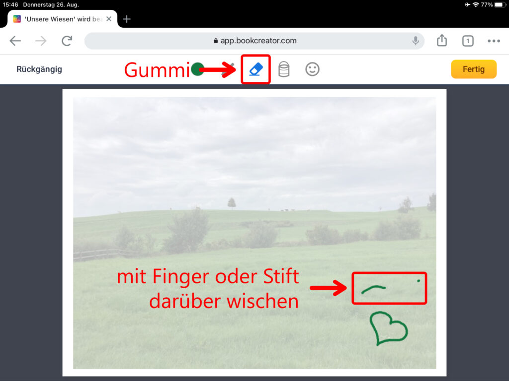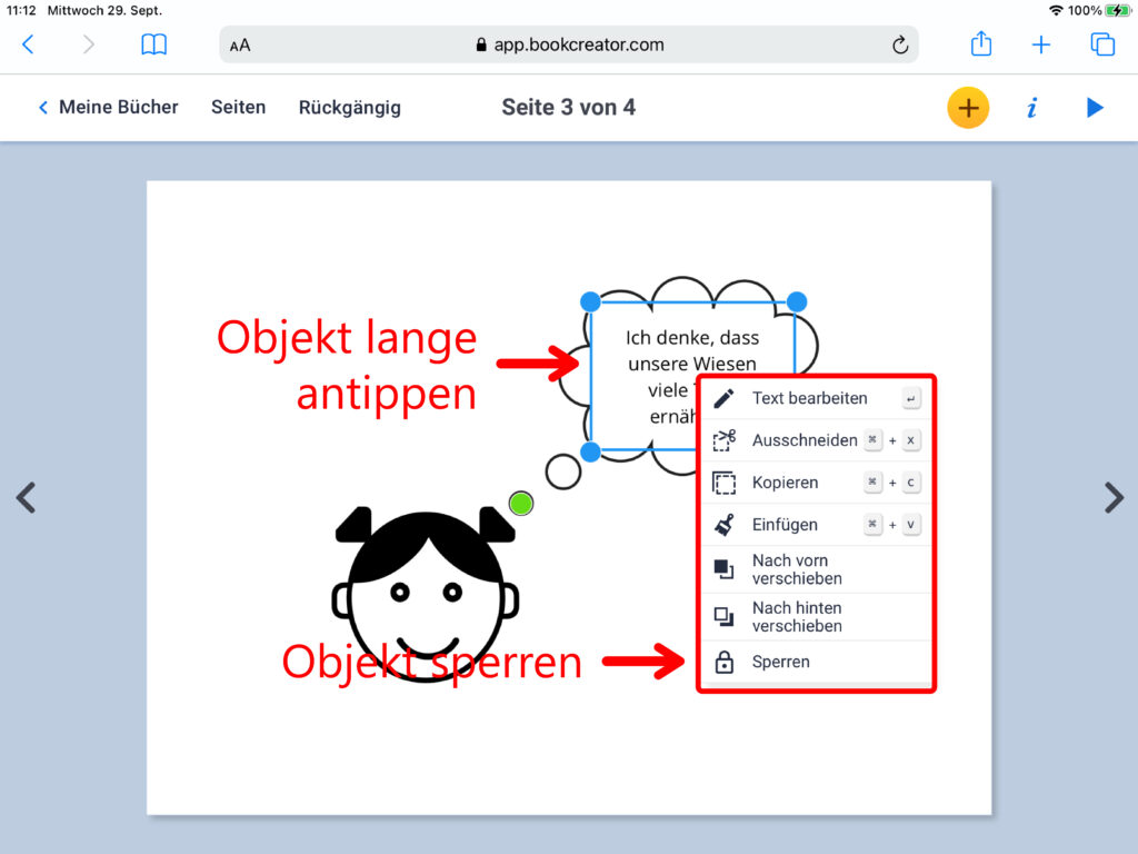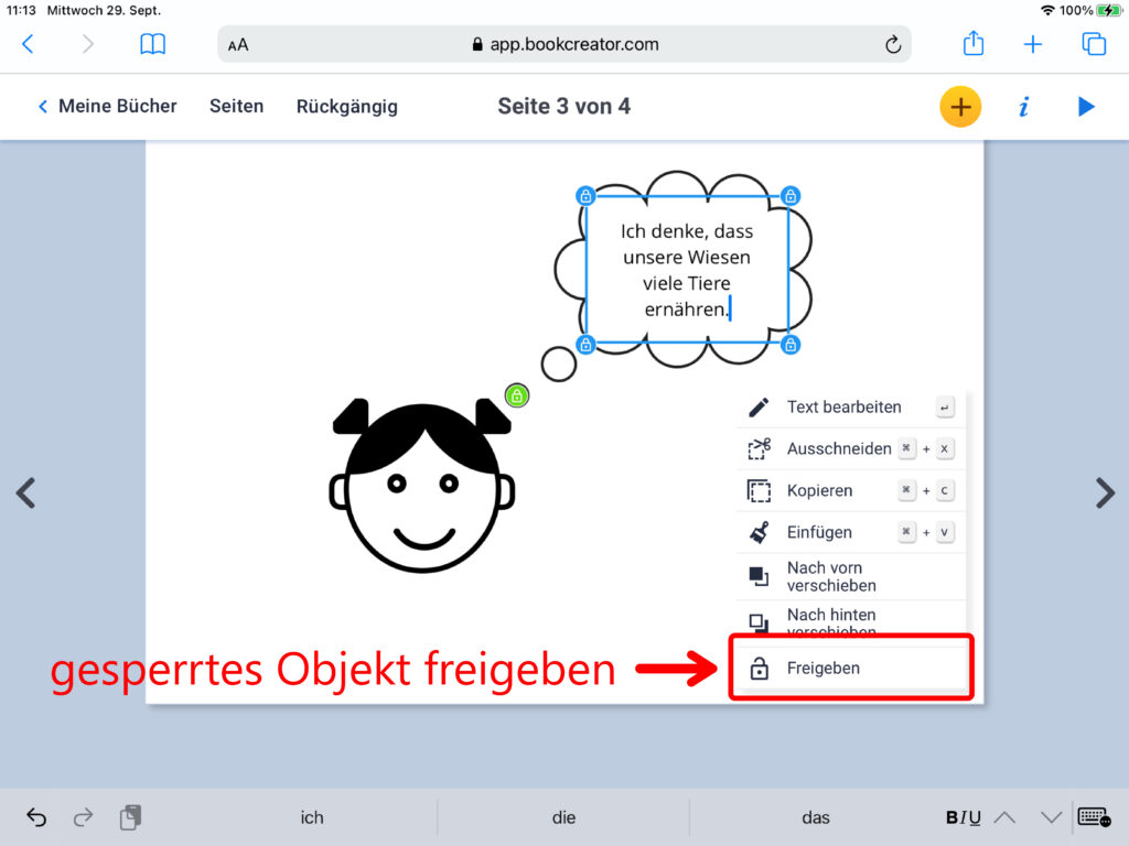 Um ein eingefügtes Objekt wieder zu löschen tippst du es an und lässt den Finger so lange auf dem Objekt ruhen, bis das Auswahlmenü erscheint. Hier kannst du das Objekt nun ausschneiden, kopieren, wieder einfügen, in den Vorder- oder Hintergrund verschieben oder zur Bearbeitung sperren. Damit verhinderst du, dass ein eigefügtes Objekt aus Versehen verschoben werden kann. Ein gesperrtes Objekt erkennt man an den kreuzförmigen Eckpunkten. Um den Schutz des Objekts aufzuheben, muss das Objekt wiederum so lange angetippt werden, bis das Auswahlmenü erscheint. Dort klickt man auf «Freigeben», um die Grösse oder Position des Objekts wieder verändern zu können.