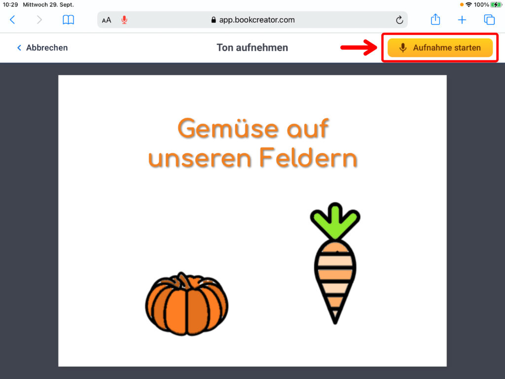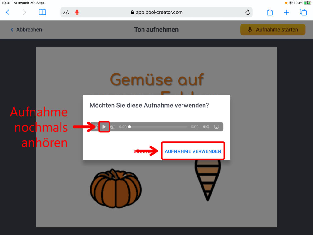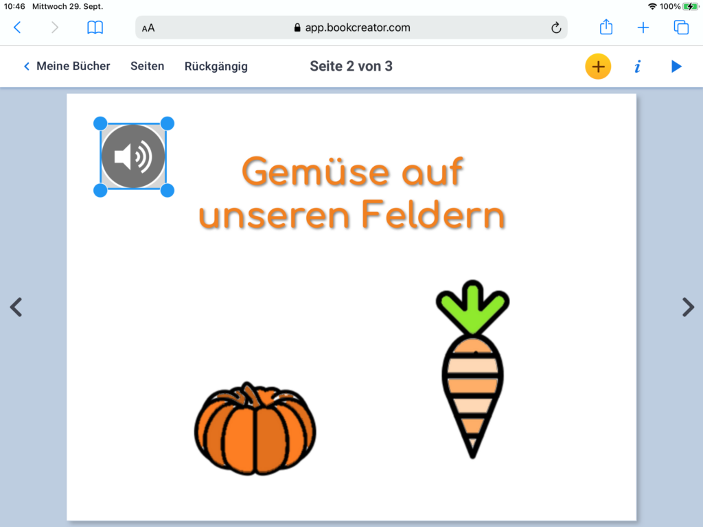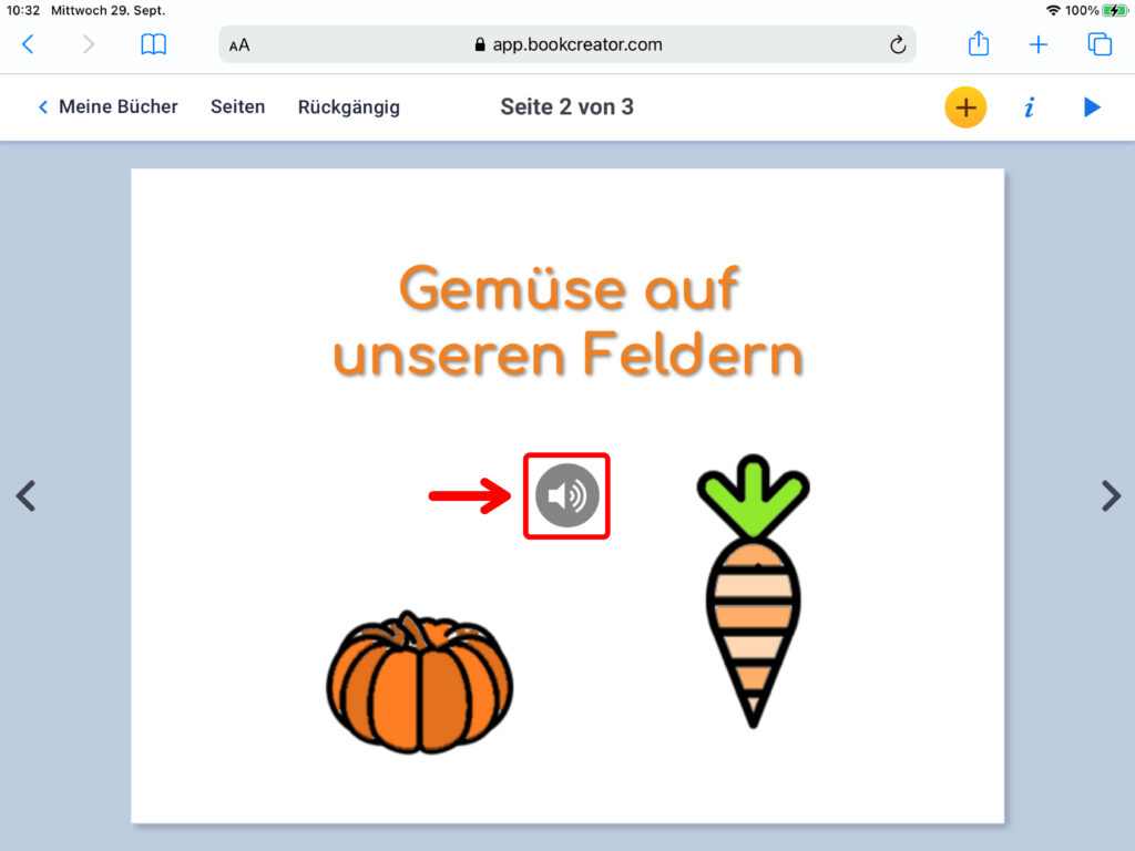 Du startest die Aufnahme mit einem Klick auf den roten Button. Du kannst auch eine bereits bestehende Aufnahme einfügen. Klicke dazu auf das Feld «Von iPad importieren» und füge die Audioaufnahme aus der Mediathek ein. Nach dem Einfügen erscheint die Aufnahme als Lautsprechersymbol. Wenn du auf das Symbol klickst, so kannst du dir anhören, was du aufgenommen hast. Auch das Lautsprechersymbol kannst du frei auf der Seite platzieren, wo immer du es haben möchtest.