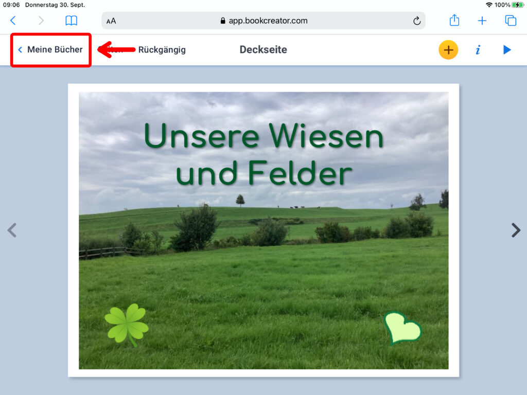 Während der Arbeit an einem E-Book wird die aktuelle Version deines Buches immer jeweils automatisch gespeichert. Um zur Übersicht über deine Bücher zu gelangen, klickst du oben links auf die Schaltfläche «Meine Bücher».