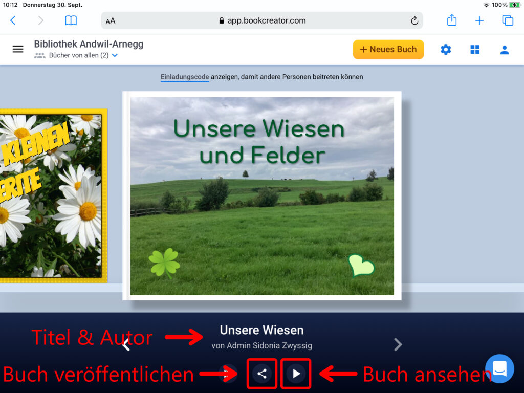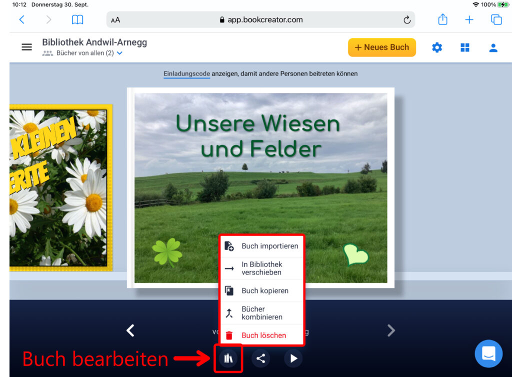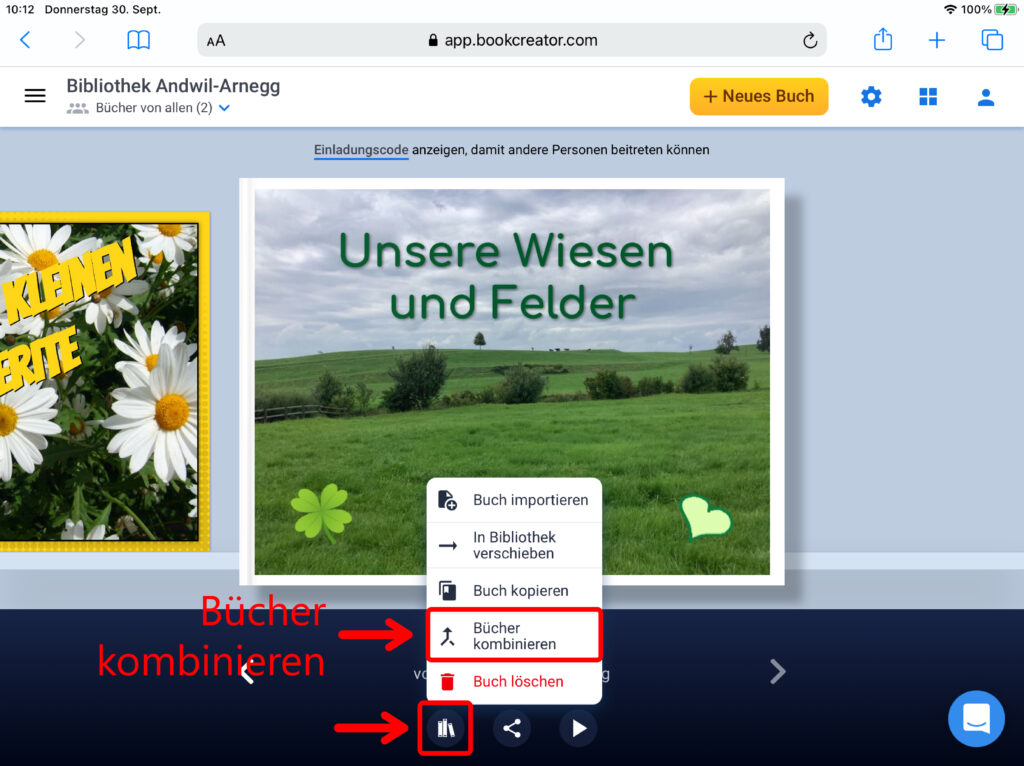 Um verschiedene Seiten oder E-Books zu kombinieren, wird bei der Übersicht aller Bücher eines der erstellten E-Books ausgewählt. Klicke auf das Symbol mit den drei Büchern und anschliessend auf das Feld «Bücher kombinieren». Nun werden alle Bücher angezeigt, die du zu einem einzigen Buch kombinieren kannst. Markiere die Bücher, welche du zu einem kombinieren möchtest, indem du sie antippst. Beachte bei der Auswahl, dass die Reihenfolge, in der du die Bücher auswählst, anschliessend beim Kombinieren der Bücher so übernommen wird. Bestimme den Titel des neuen E-Books und den Autor und klicke auf «Buch erstellen». Das neue E-Book erscheint in deiner Bibliothek.