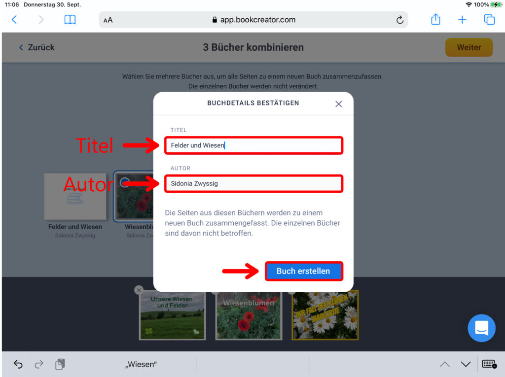 Klicke nun unterhalb eines Buches auf den Titel, um dem Buch einen neuen Titel zu geben und den Autor zu nennen.