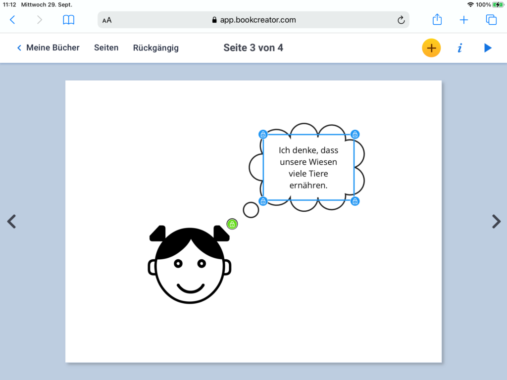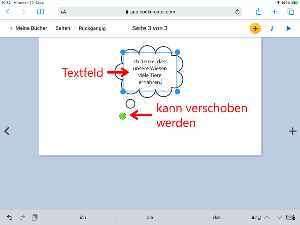 Beim Einfügen einer Sprech- oder Denkblase wird sogleich ein Textfeld erstellt, über welches der Text eingefügt werden kann. Über den grünen Punkt können der Ursprung, die Distanz und die Richtung der Blasenpunkte verändert werden.