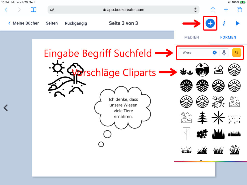 Wechselst du vom Abschnitt «Medien» zum Abschnitt «Formen», so hast du die Möglichkeit, verschiedene Linien, Denk- oder Sprechblasen, verschiedene Pfeile oder andere geometrische Formen einzufügen. Fügst du eine der vorgegebenen Sprech- oder Denkblasen ein, so erscheint automatisch ein Textfeld, in welches du den passenden Text hineinschreiben kannst. Über die Eingabe im Suchfeld können noch viele weitere Vorlagen gesucht und eingefügt werden.