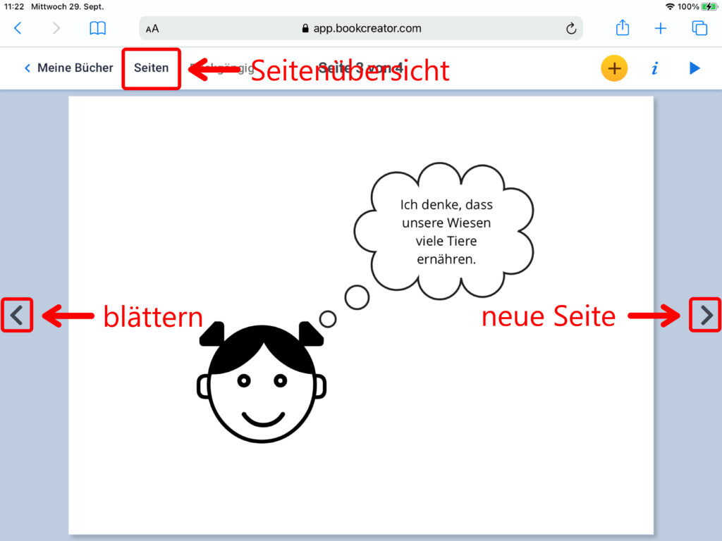 Um deinem E-Book weitere Seiten hinzuzufügen, klickst du auf den Pfeil am rechten Rand der Seite. Oberhalb siehst du jeweils, auf welcher Seite du dich aktuell gerade befindest. Zum Blättern klickst du einfach auf die Pfeile nach rechts oder links.