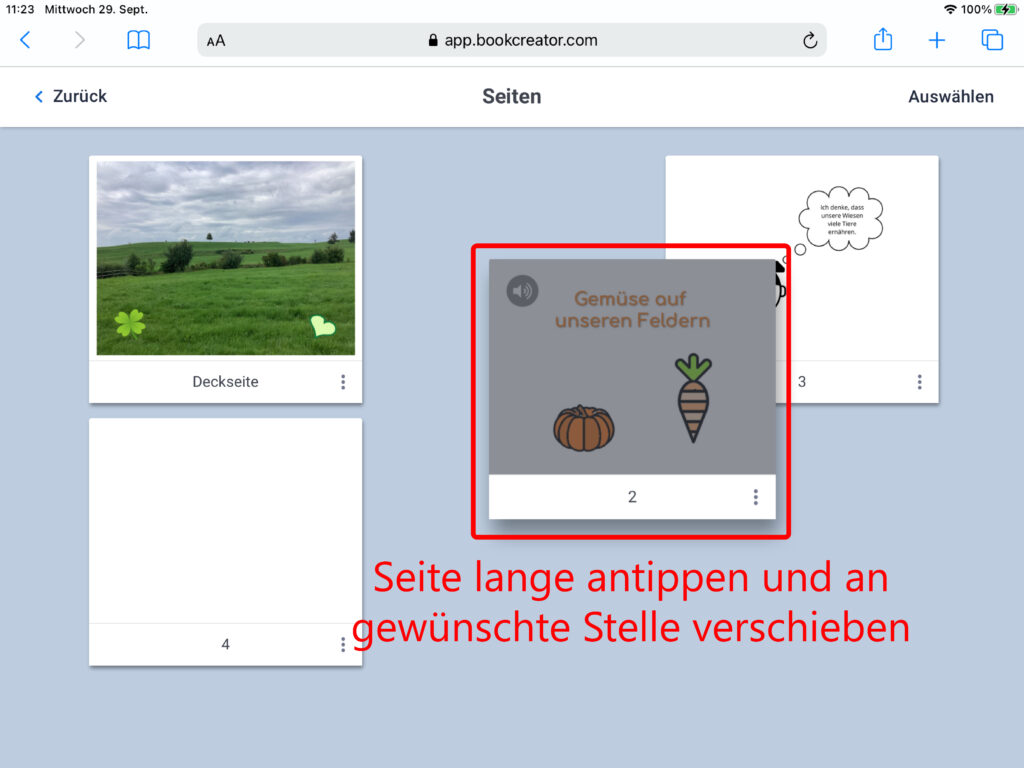 Mit einem Klick auf die Schaltfläche «Seiten» am linken oberen Rand gelangst du zur Übersicht der gestalteten Seiten deines E-Books. Es erscheinen alle Seiten, die du bereits erstellt hast. Um die Reihenfolge der Seiten anzupassen, verschiebst du diese, indem du den Finger auf die Seite legst und sie an die gewünschte Stelle ziehst.