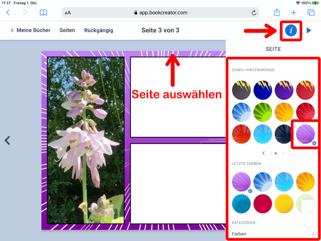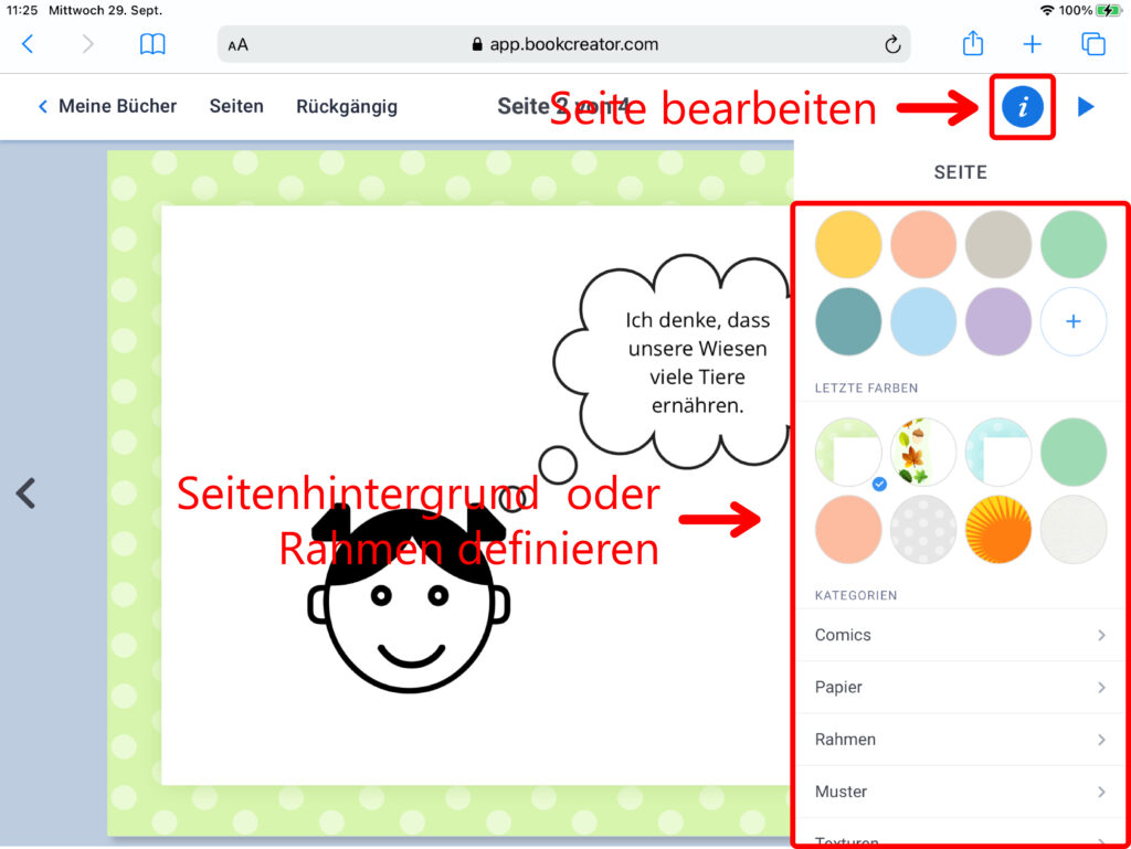 Über einen Klick auf das «i»-Symbol lässt sich die Seite gestalten. So kannst du beispielsweise die Hintergrundfarbe einer Seite anpassen oder eine der verschiedenen Hintergrund-Vorlagen oder Rahmen auswählen.