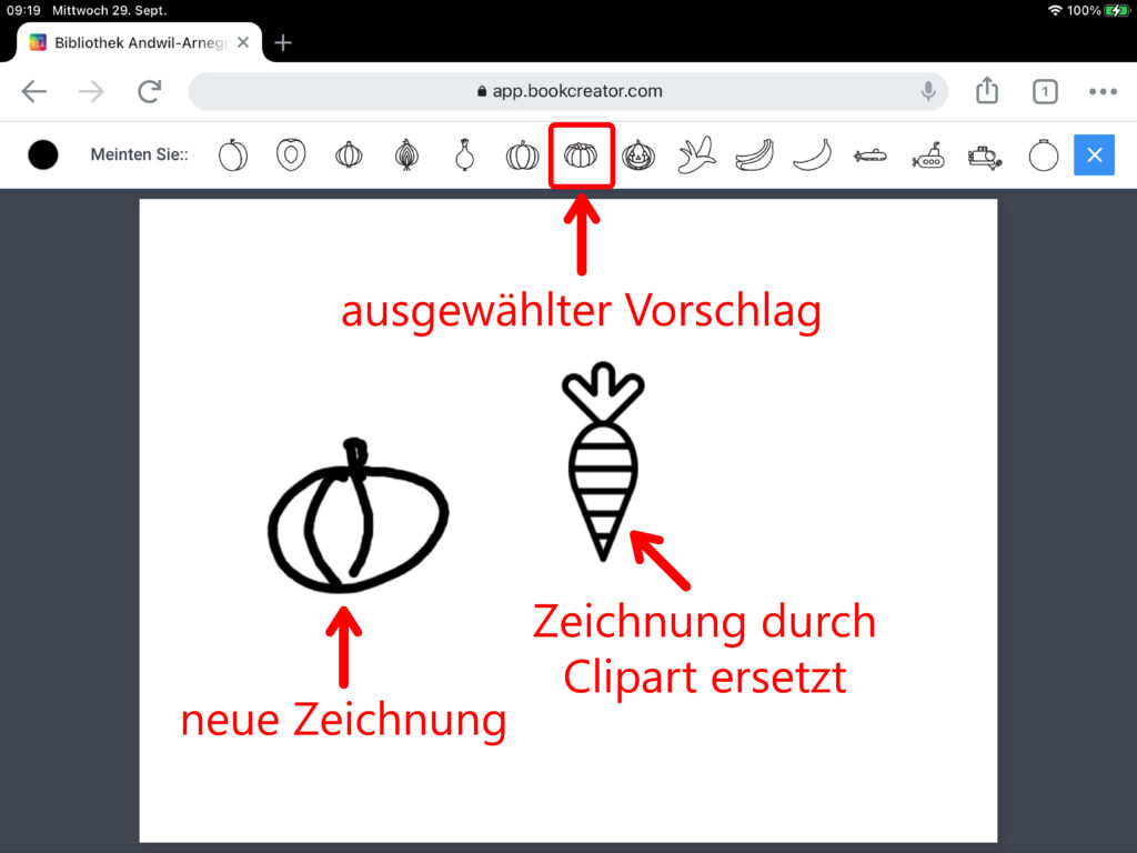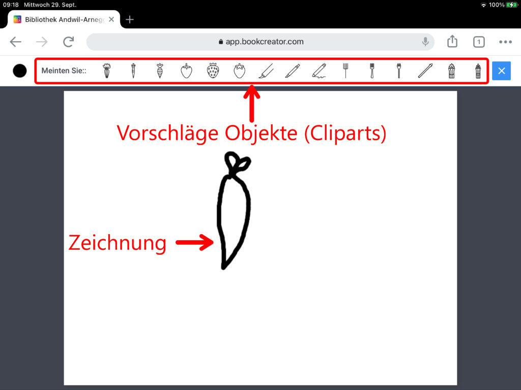 Im Programm «AutoDraw» versucht der Computer, bei einer selbst erstellten Zeichnung zu erkennen, um was es sich dabei handeln könnte. Der Computer macht dann Vorschläge mit Cliparts, durch welche die eigene Zeichnung ersetzt werden kann.