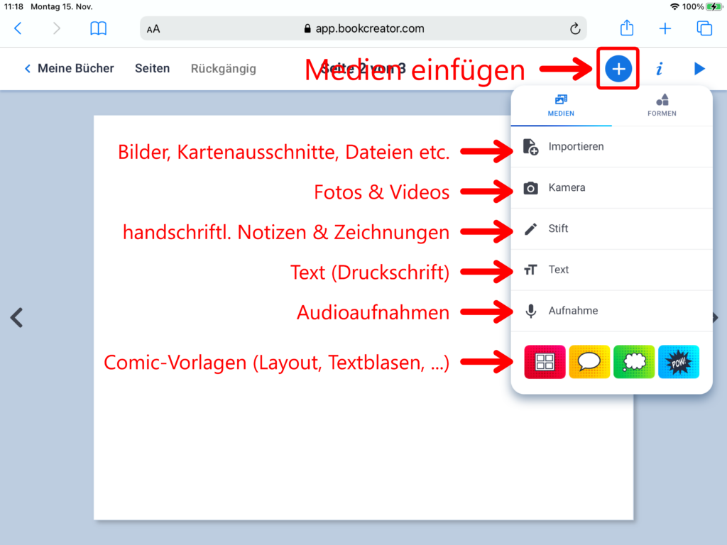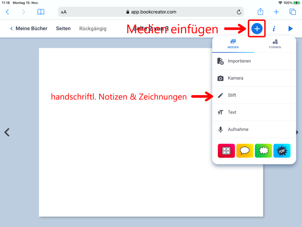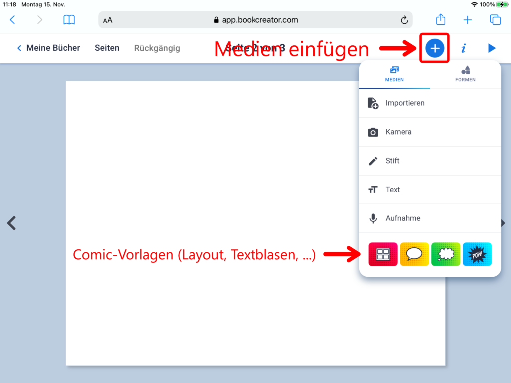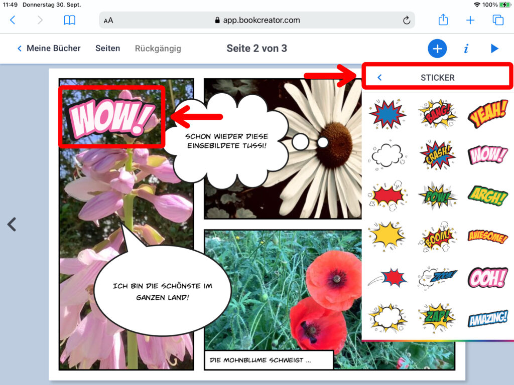 Nebst den bereits bekannten Bereichen «Medien» und «Formen», erscheint beim Klick auf das Plus-Symbol nun zusätzlich der Menüpunkt «Comics». Über diesen lassen sich Vorlagen zum Seitenlayout im Comicstil, Sprechblasen oder Gedankenblasen einfügen. Über einen Klick auf das Feld «Sticker» öffnet sich eine Auswahl zu Comic-typischen Stickervorlagen.
