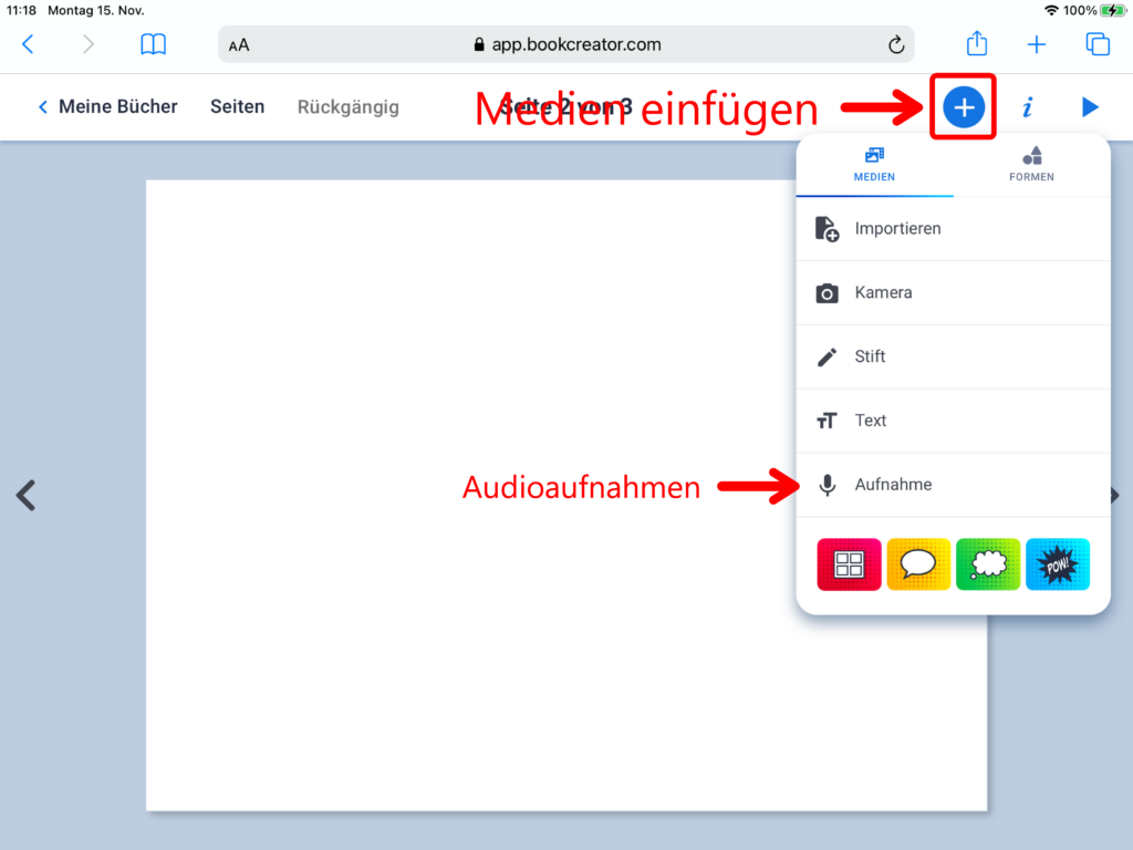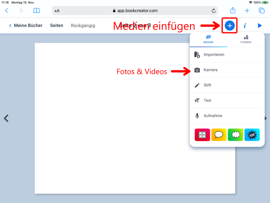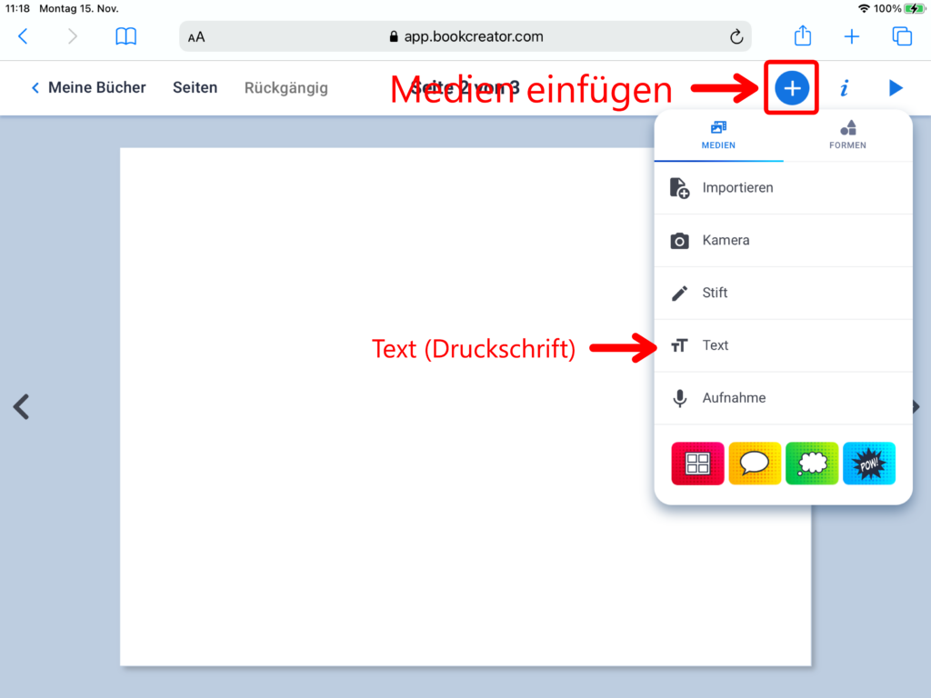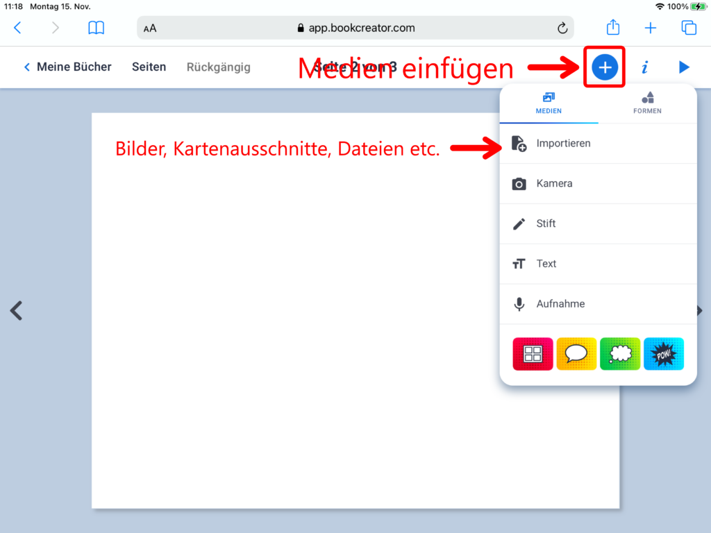 Nebst den bereits bekannten Bereichen «Medien» und «Formen», erscheint beim Klick auf das Plus-Symbol nun zusätzlich der Menüpunkt «Comics». Über diesen lassen sich Vorlagen zum Seitenlayout im Comicstil, Sprechblasen oder Gedankenblasen einfügen. Über einen Klick auf das Feld «Sticker» öffnet sich eine Auswahl zu Comic-typischen Stickervorlagen.