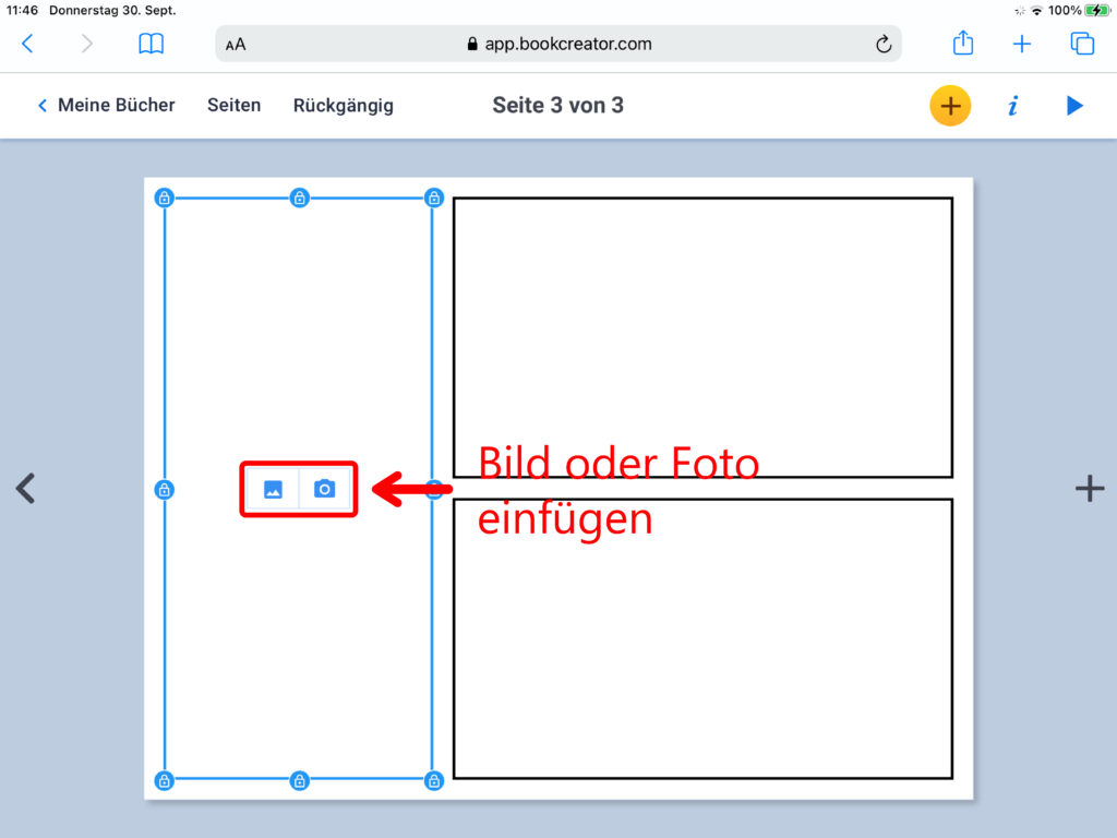 Wurde eine Comicvorlage als Seitenlayout ausgewählt, so erscheinen beim Klick in eines der Felder die Symbole Bild und Kamera. Über den Klick auf das Bild erhält man Zugriff auf die Fotomediathek, mit einem Klick auf die Kamera öffnet sich der Kameramodus und fügt die Aufnahme anschliessend im gewünschten Feld ein.