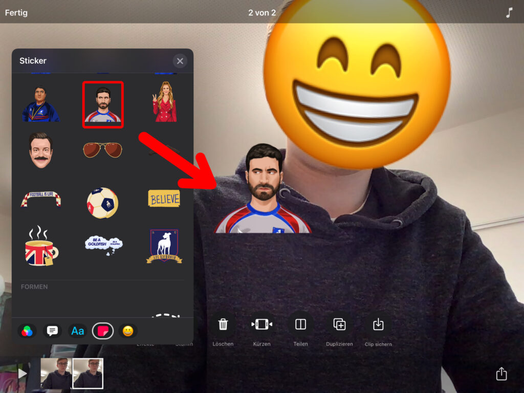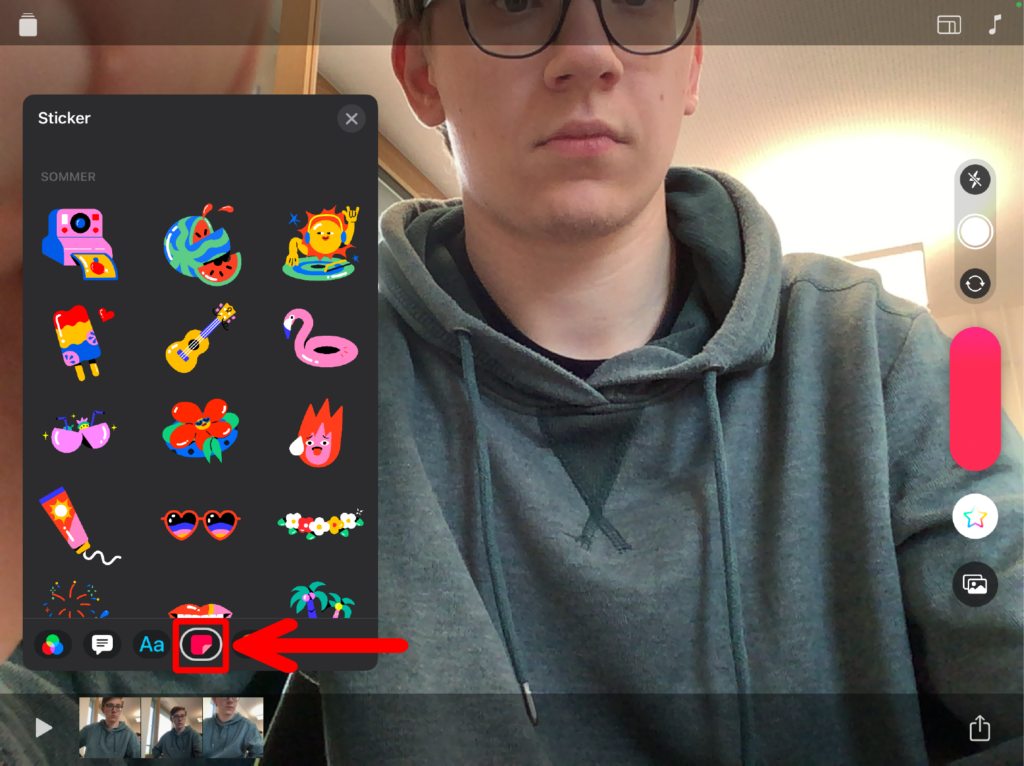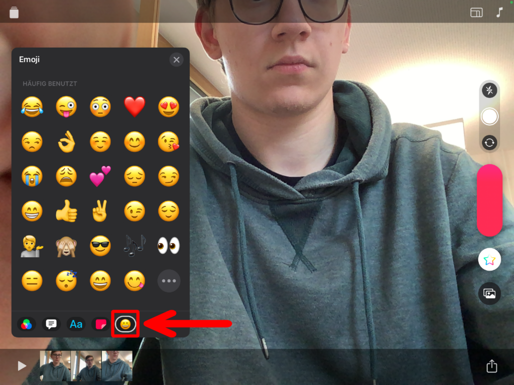 Weiter gibt es eine Sticker Galerie, welche über einen Klick auf den roten Post-it Zettel geöffnet wird. Auch Emojis lassen sich über einen Klick auf das «Smiley-Symbol» dem Video hinzufügen. Um die Position oder Grösse von Stickern und Emojis zu ändern, musst du sie ziehen, drehen oder mit den Fingern auf- oder zuziehen.