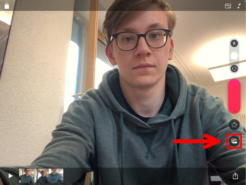 Man kann die Kameraeinstellung wechseln, indem man in der rechten Auswahlleiste auf das runde Symbol mit den zwei Pfeilen klickt. Nun wird die Back-Kamera zur Aufnahme verwendet.
