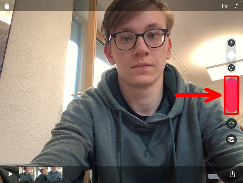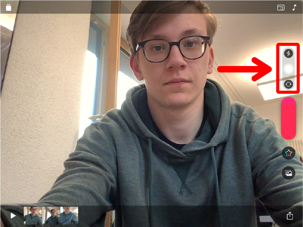 Über die drei Symbole über dem Aufnahmebalken lassen sich Einstellungen zur Kamera vornehmen. Mit einem Klick auf das «Blitz-Symbol» aktivierst oder deaktivierst du den Blitz. Mit einem Klick auf den weissen, runden Kreis erstellst du ein Foto. Lege nach dem Erstellen des Fotos deinen Finger so lange auf die rote Aufnahmetaste, wie das Foto in deinem fertigen Clip zu sehen sein soll. Über das «Pfeil-Symbol» wechselst du zwischen der Front- und der Backkamera.