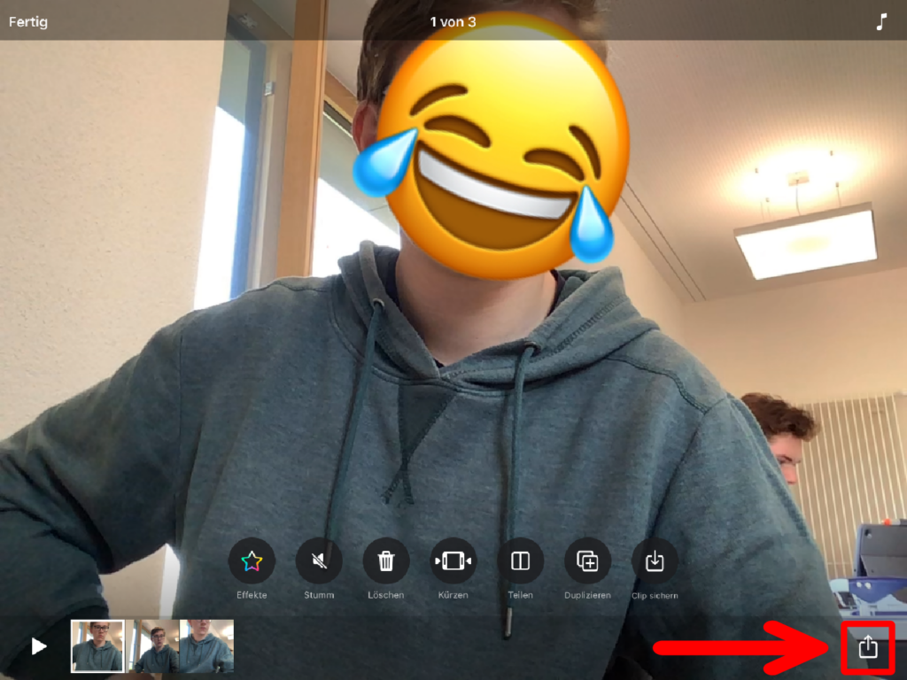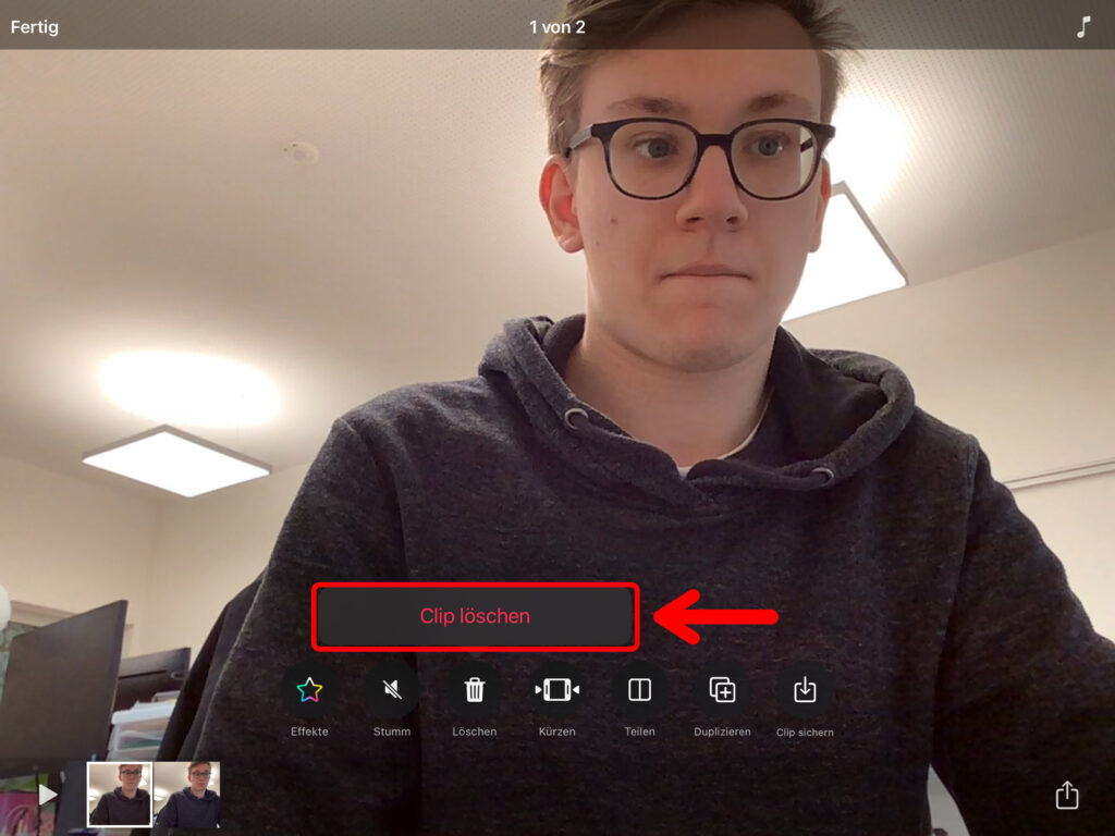 Um einen Clip zu löschen, wählst du ihn aus und tippst anschliessend auf das Symbol mit dem Papierkorb. Somit löschst du den Clip.
