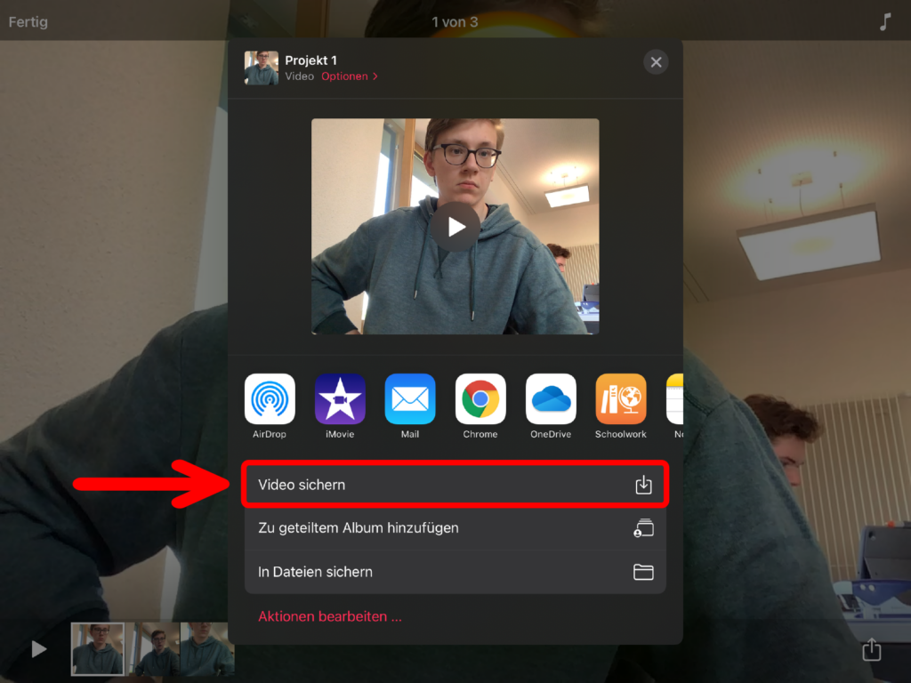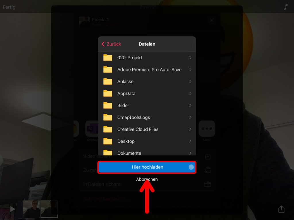 Bist du mit deinem Clip zufrieden, so kannst du ihn exportieren. Tippe dazu falls nötig zuerst oben links auf «Fertig». Tippe anschliessend auf das «Upload-Symbol» unten rechts. Hier werden dir nun die verschiedenen Möglichkeiten zum sichern und exportieren deines Videos angezeigt. Klicke auf das Wolken-Symbol, um den Clip in deinem OneDrive abzuspeichern. Klickst du auf «Video sichern», so wird das Video in deine Foto-Mediathek geladen. Mit einem Klick auf «In Dateien sichern» öffnet sich die Auswahl der verschiedenen Speicherorte auf deinem iPad.