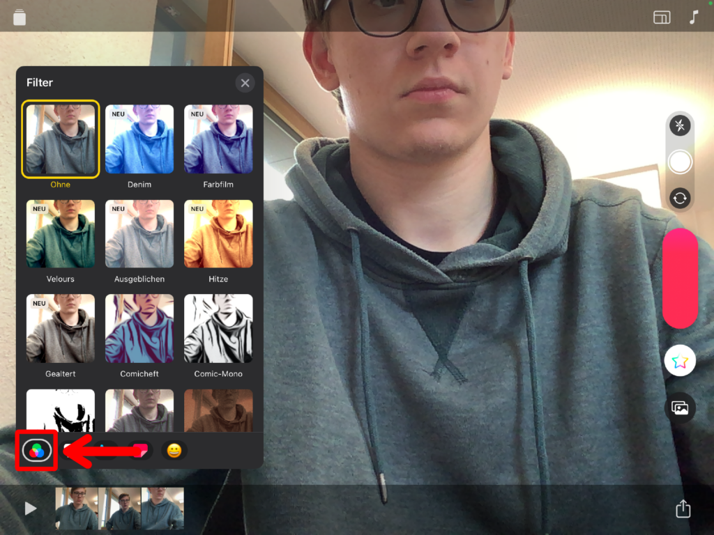 Du kannst einen Filter aktivieren, um ihn während der Aufnahme hinzuzufügen, oder ihn auf einen bestehenden Clip in deinem Video anwenden. Du kannst auch einen Filter aktivieren, bevor du ein Foto oder einen Clip aus deiner Mediathek bzw. ein Bild von einer Webseite hinzufügst.