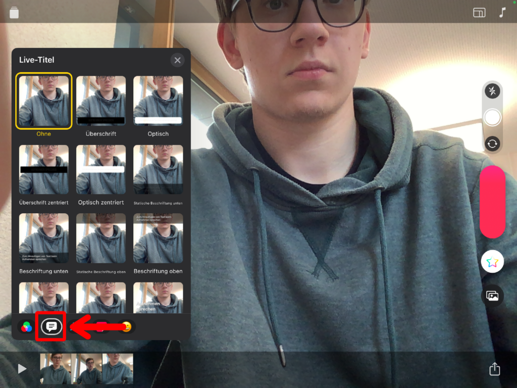 Beim Hinzufügen von Live-Titeln wird alles Gesprochene als Text über dem Video eingeblendet. Diese Funktion musst du vor dem Aufnehmen eines Videos auswählen. Sie kann nicht nachträglich hinzugefügt werden. Bedenke, dass du dazu laut und deutlich und in hochdeutscher Sprache sprechen musst.