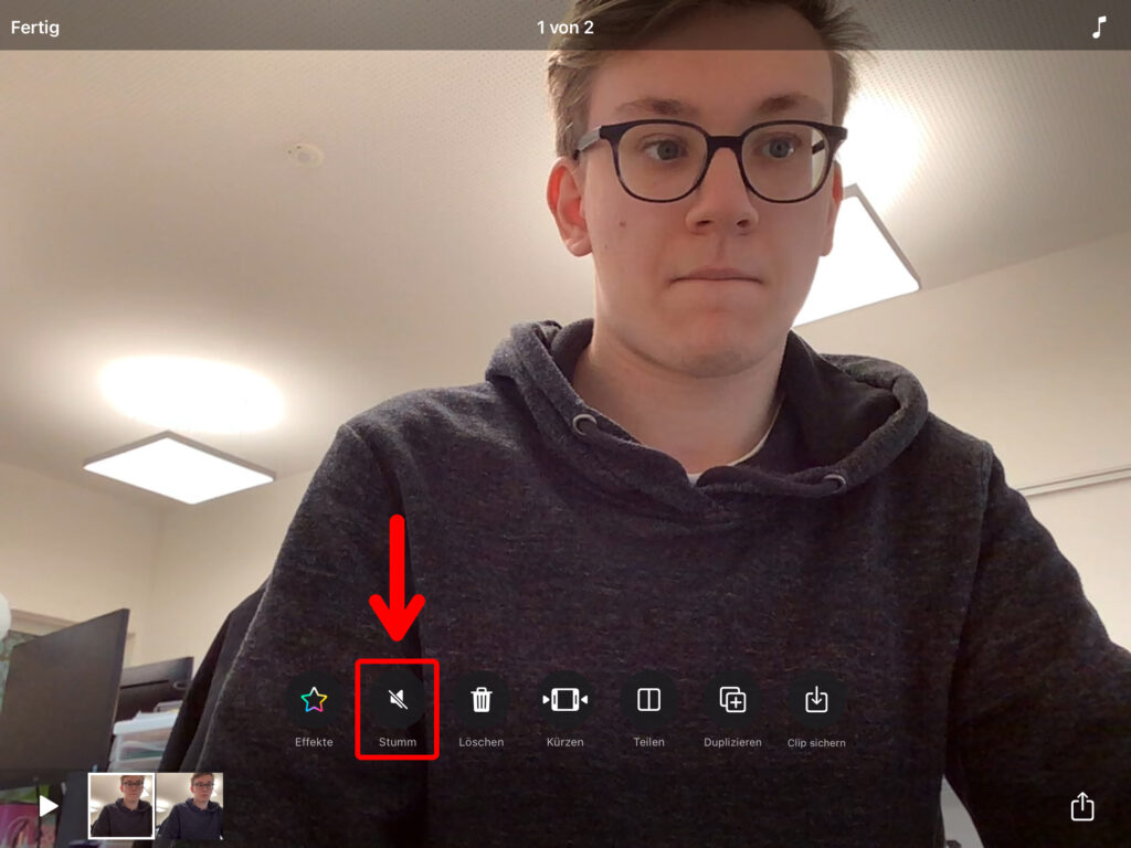 Um den Clip stumm zu schalten, wählst du den gewünschten Clip aus und tippst auf «Stumm». Das Lautsprecher-Symbol wird durchgestrichen dargestellt. Tippe nochmals auf den Lautsprecher, um die Einstellung rückgängig zu machen.