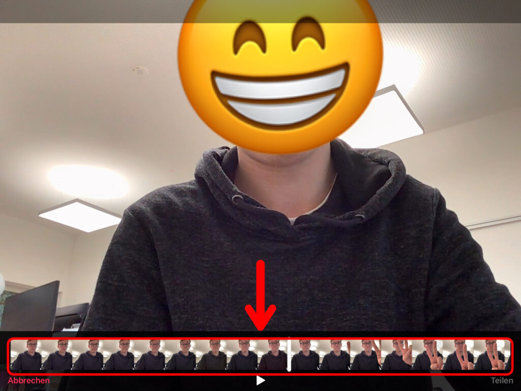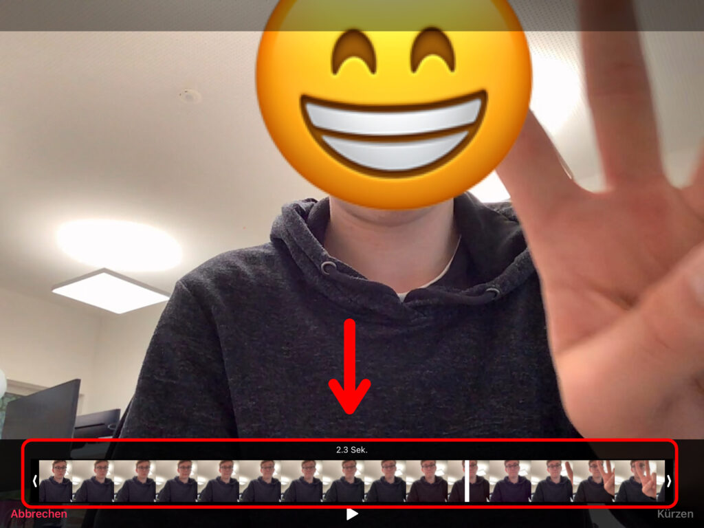 Eine sehr nützliche Funktion ist das «Kürzen». Hier kann man die Länge des Clips anpassen. Tippe in einem geöffneten Video einen Clip und anschliessend auf «Kürzen». Ziehe dann den Start- und den Endmarker an die gewünschte Stelle und tippe anschliessend auf «Kürzen».
