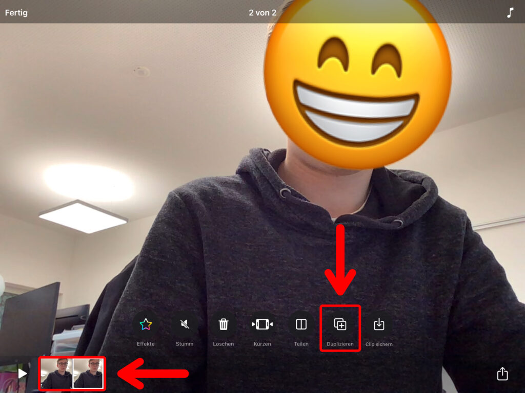 Um eine Kopie deines Clips zu erstellen, wählst du den Clip aus und tippst auf das «Stapel-Plus-Symbol». Der Clip wird dupliziert und ein zweites Mal eingefügt.