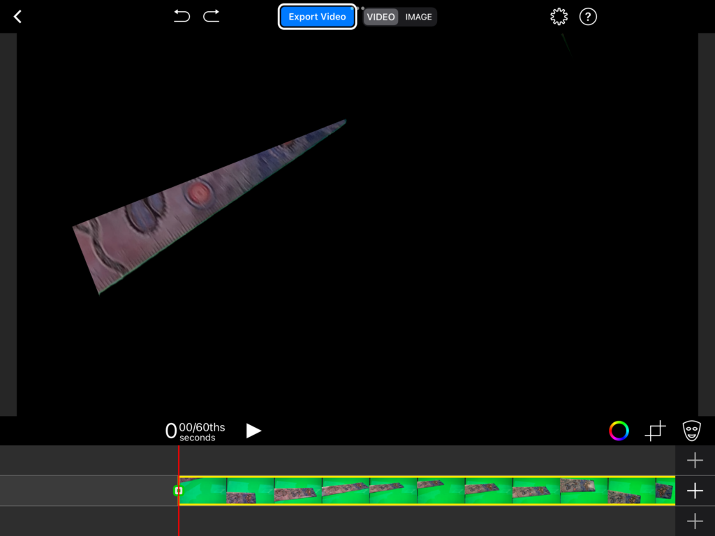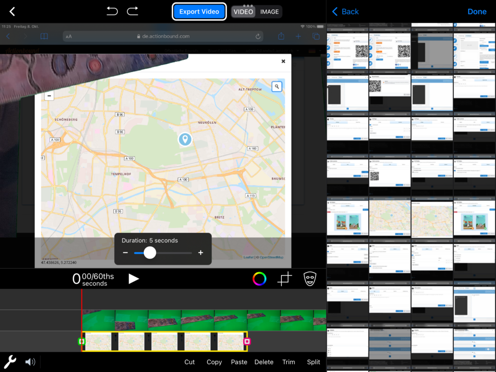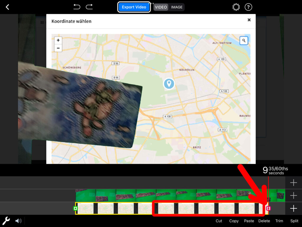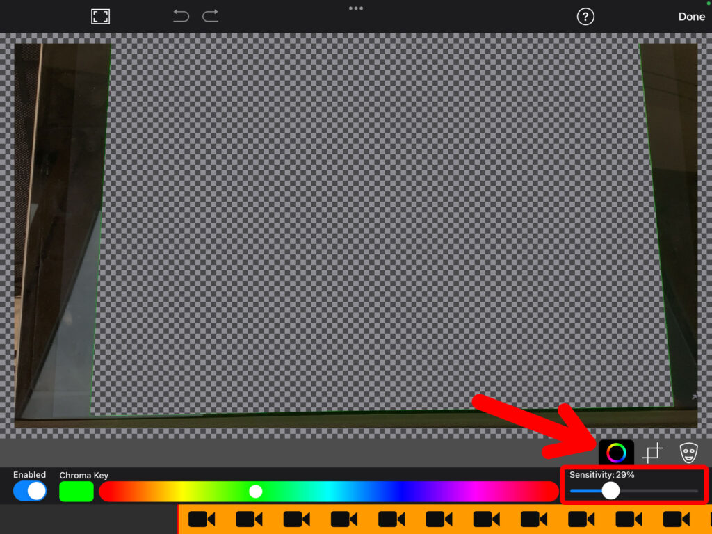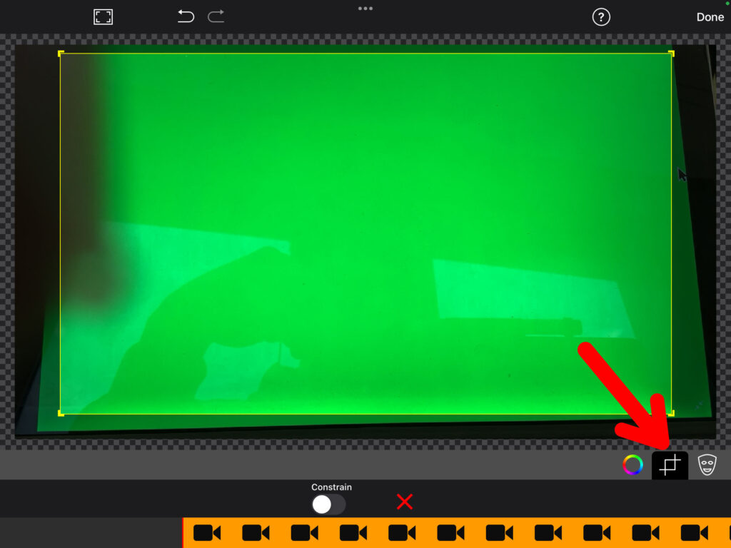 Möchtest du das eingefügte Bild noch zuschneiden, so wählst du wiederum die Greenscreen-Aufnahme aus und klickst anschliessend auf das «Zuschneide-Symbol» (rechts vom farbigen Kreis). Beschneide nun die Aufnahme, sodass nur noch ersichtlich ist, was eingefügt werden soll. Mit einem Klick auf «Done» oben rechts bestätigst du die Anpassung.