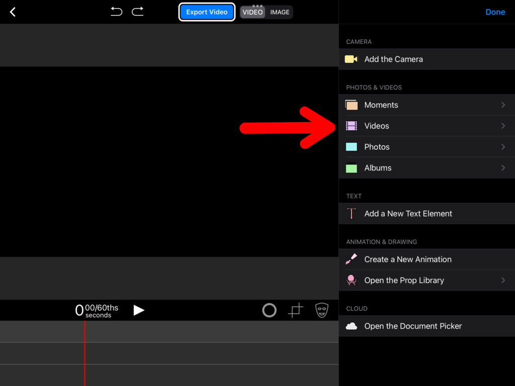 Um ein Bild oder Video in die App importieren zu können, klickt man unten rechts auf das blaue Plus-Zeichen und wählt dann den Ordner «Videos» oder «Photos» aus. Achte darauf, in welche Spur du was importierst!