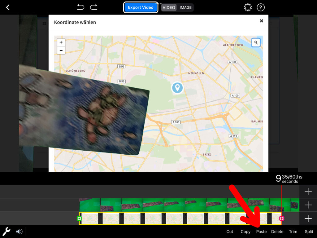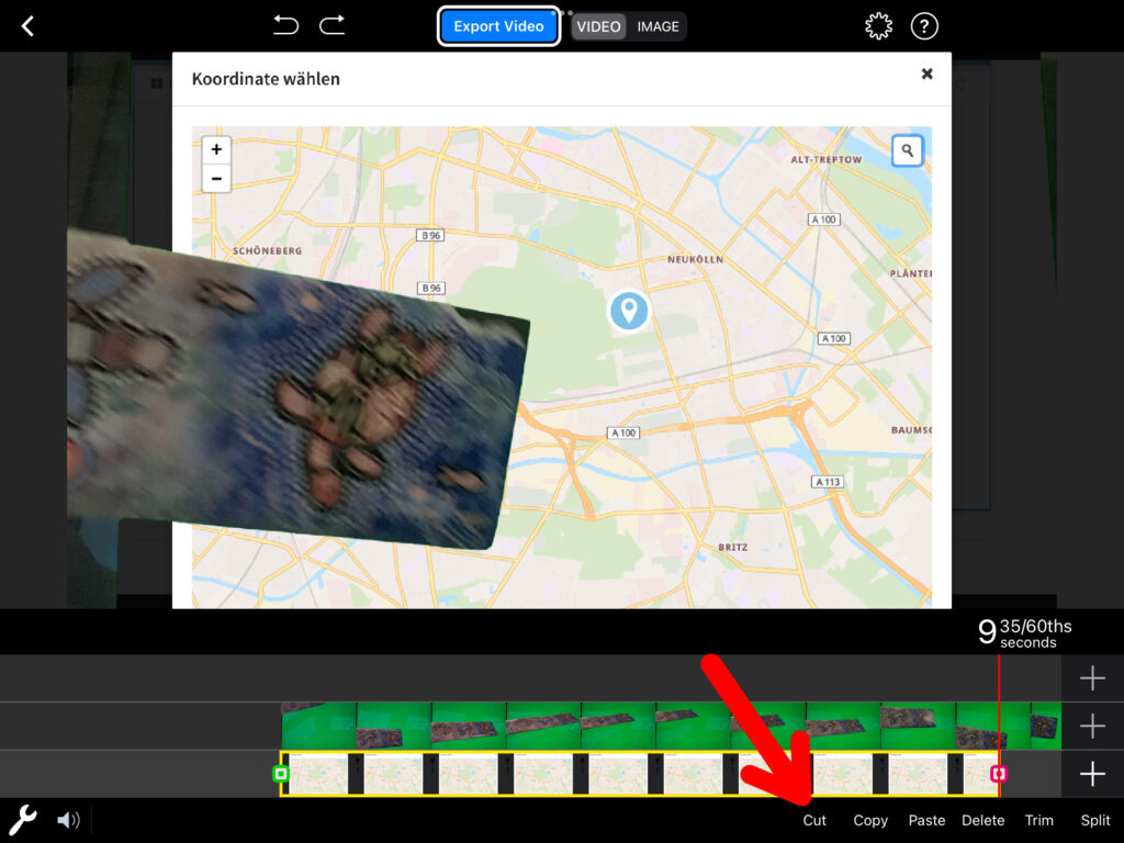 In die unterste Spur lädst du das Bild oder Video, welches den grünen Hintergrund ersetzen soll. Hast du das Hintergrundbild aus Versehen in die falsche Spur importiert, so kannst du das bei Bedarf noch ändern. Klicke dazu zweimal auf die Aufnahme und anschliessend unten rechts auf «Copy» und anschliessend auf «Cut». Nun wählst du die Spur, in welche du die Aufnahme einfügen möchtest und klickst auf «Paste».