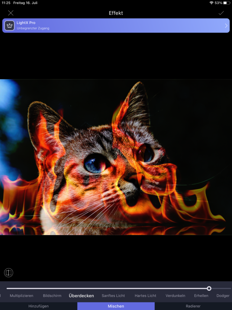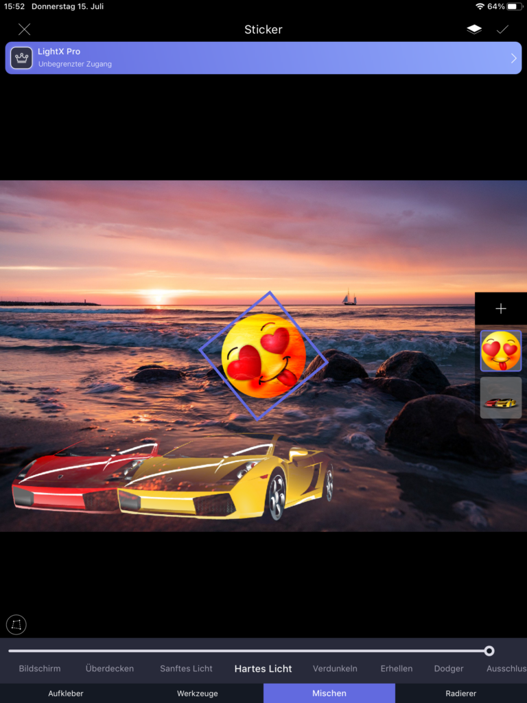 Klickst du auf «Mischen», so kannst du Sticker aufhellen, verdunkeln und andere Lichteffekte anwenden. Scrolle in der Bearbeitungsleiste unterhalb nach rechts, um dir alle möglichen Effekte anzusehen. Hast du einen Effekt ausgewählt, so bestimmst du über den Schieberegler, wie stark oder schwach der Effekt auf das Bild angewendet werden soll.