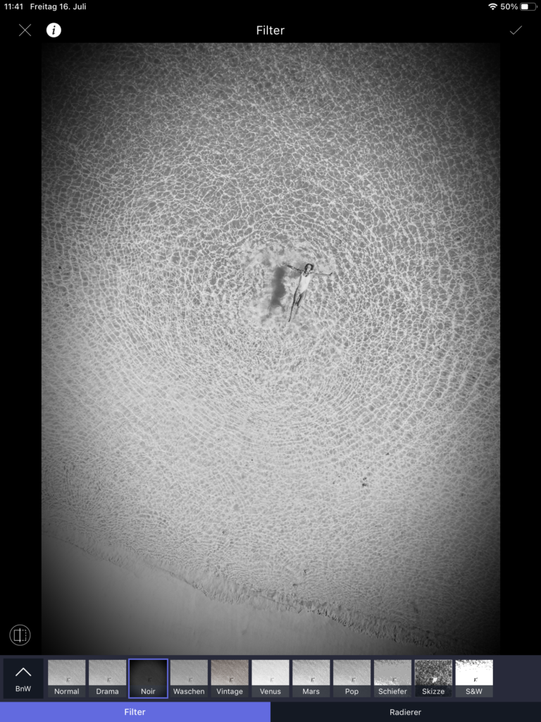 Über einen Klick auf «Filter» kannst du verschiedene Filter über dein Bild legen. Über einen Klick auf das Symbol mit dem zweigeteilten Quadrat unten links kannst du jeweils zwischen den beiden Versionen (mit und ohne Filter) wechseln.