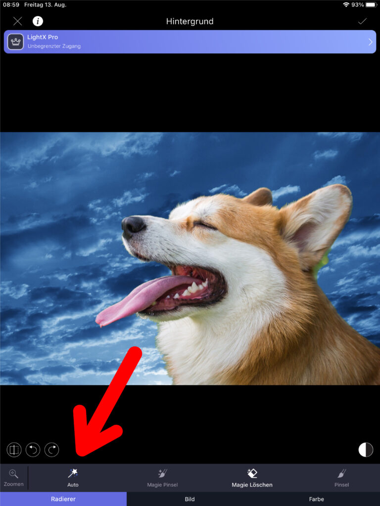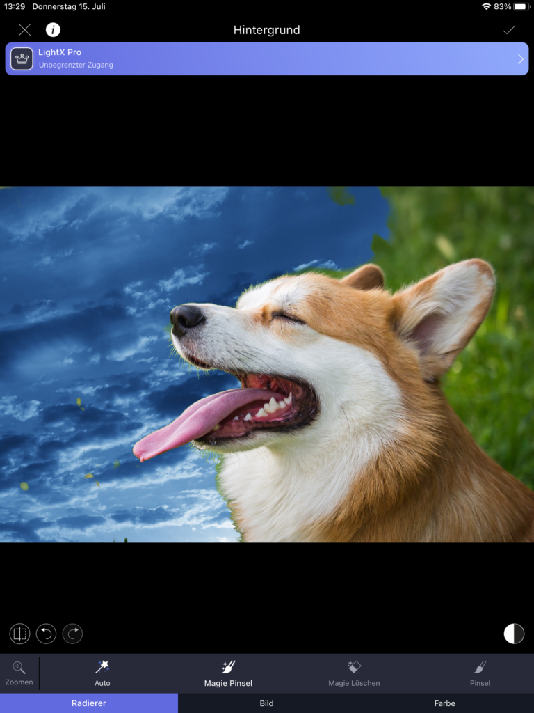 Der aktuelle Hintergrund kann auch ausgetauscht werden. Das funktioniert über die Funktion «Hintergrund». Hierbei wählst du den neuen Hintergrund aus und wischst anschliessend mit dem Finger über den alten Hintergrund, der durch den neuen ersetzt werden soll. Du kannst auch die «Auto-Funktion» nutzen. Damit versucht das Programm automatisch, den Hintergrund zu erkennen und diesen durch den ausgewählten neuen Hintergrund zu ersetzen.