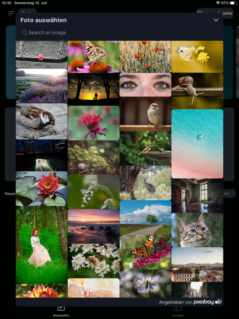 Über das Suchfeld kannst du nach Hintergrundbildern, Stickern, Emojis, Rahmen etc. suchen.