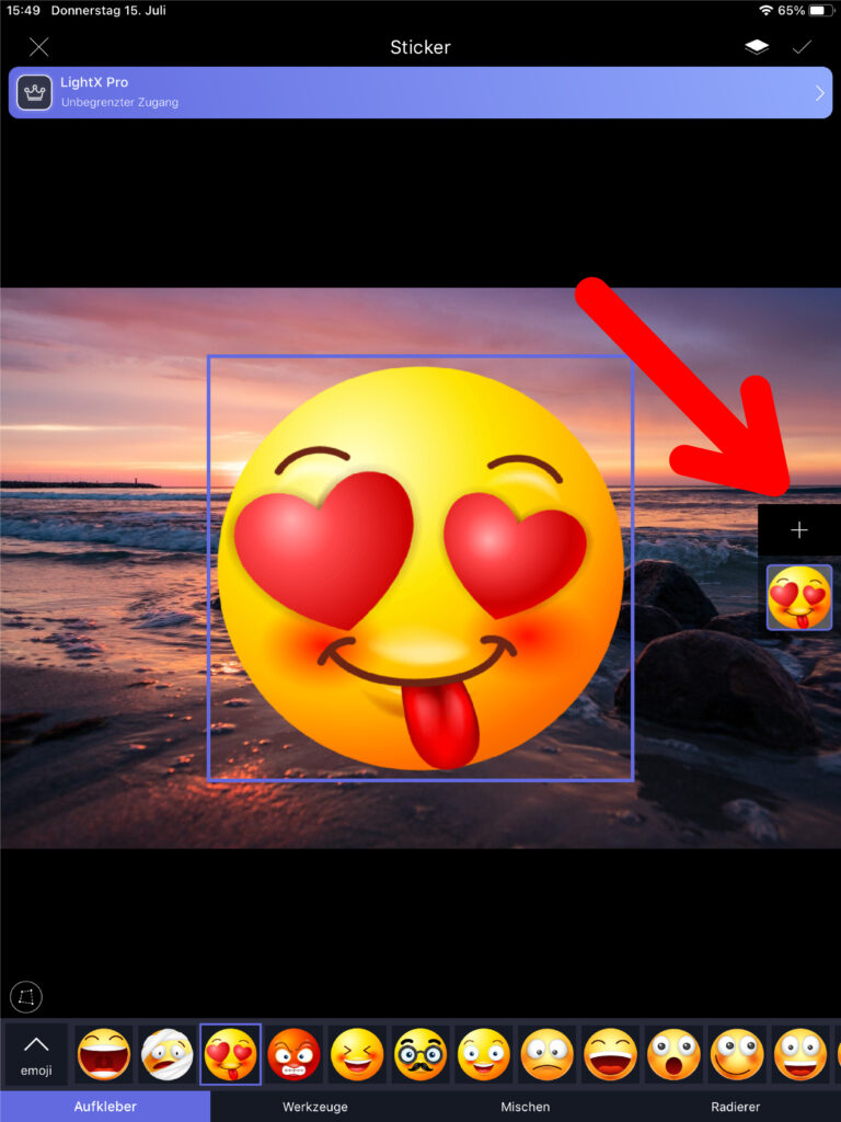 Möchtest du einen weiteren Sticker hinzufügen, klickst du am rechten Bildschirmrand auf das «Plus-Zeichen». Danach kannst du einen beliebigen weiteren Aufkleber hinzufügen.
