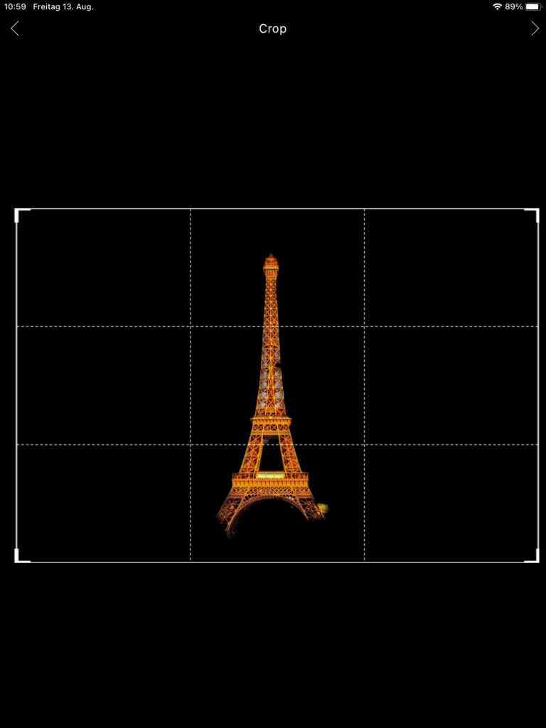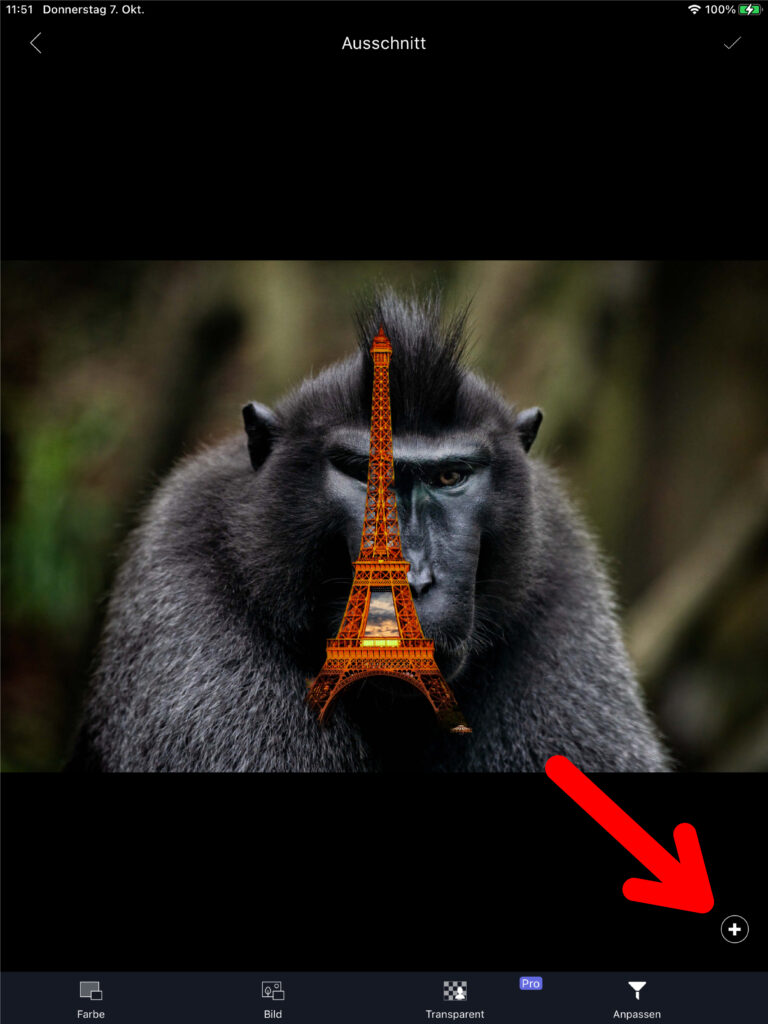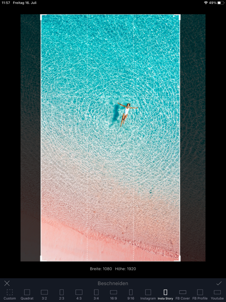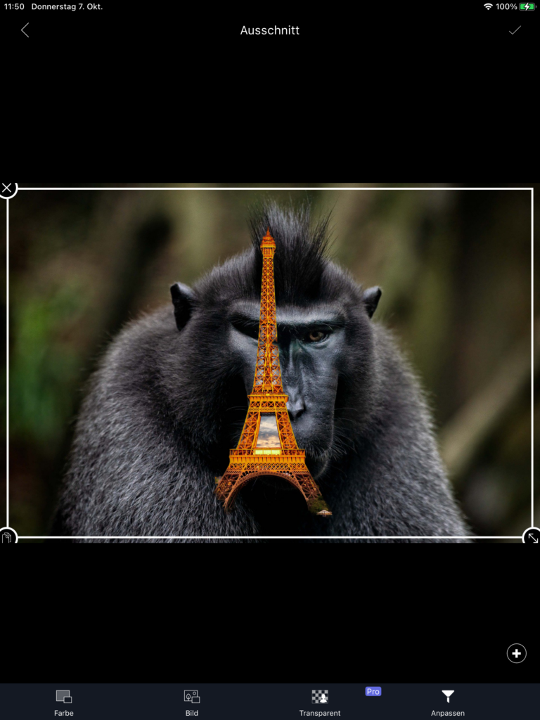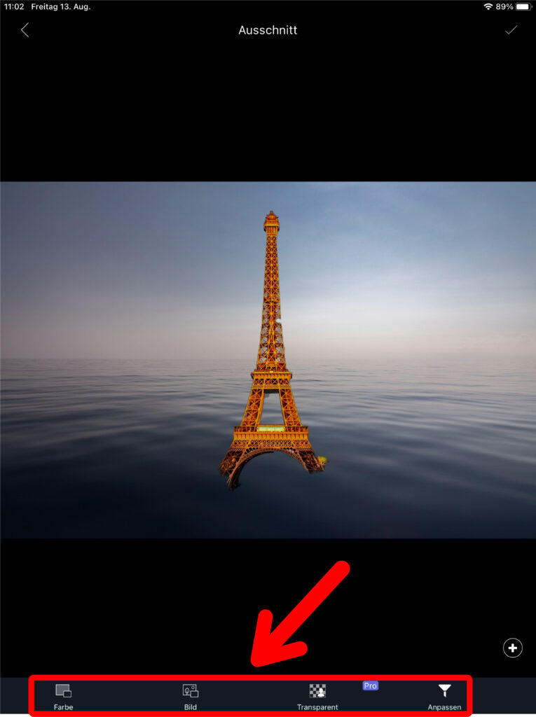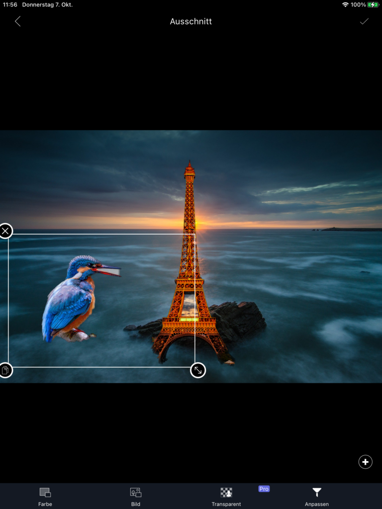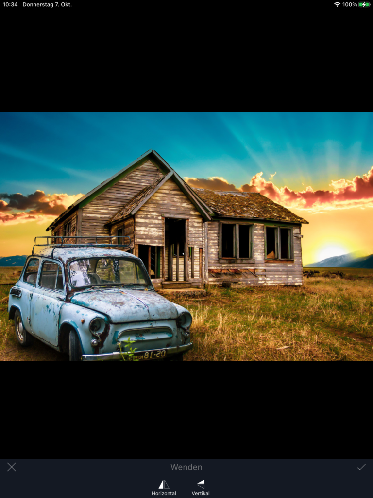 Das Foto kann in ein beliebiges Format beschnitten oder gedreht werden. Klicke dazu bei der Auswahl der Werkzeuge auf «Transformieren». Nun kannst du das Bild zuschneiden oder es drehen. Nutze dazu die dir bekannten Touchgesten. Über die Funktion «Wenden» kannst du das Bild sowohl horizontal als auch vertikal spiegeln.