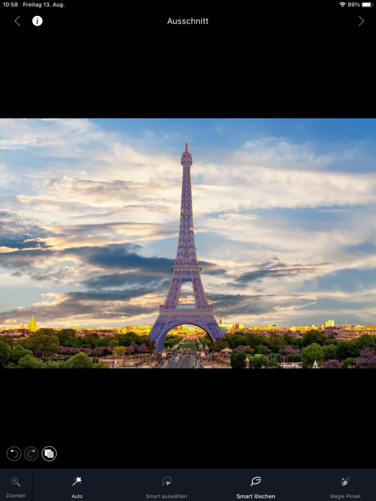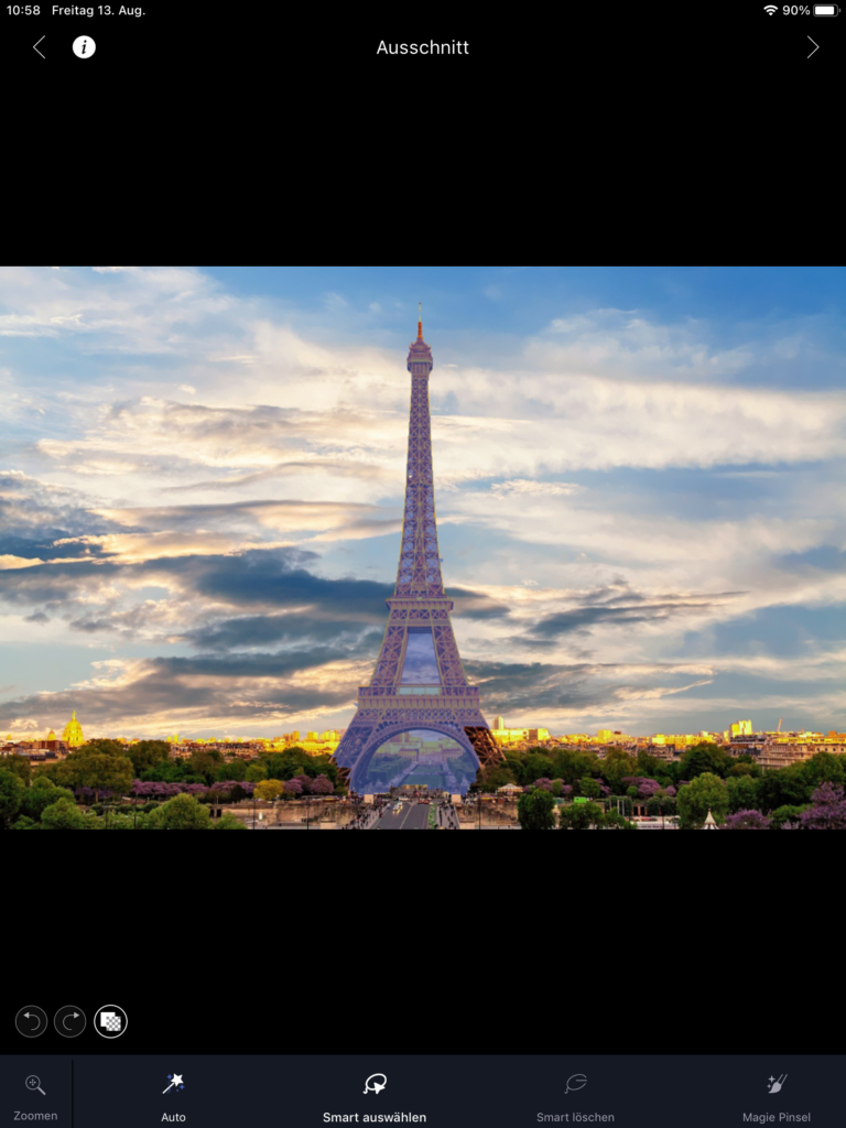 Klicke zuerst auf «Ausschnitt» oder «Objekt». Du hast dun die Möglichkeit, selbst die Bildstellen zu markieren, welche freigestellt werden sollen oder die «Auto-Funktion» zu nutzen. Auch bei der Auto-Funktion hast du anschliessend die Möglichkeit, über «Smart auswählen» Bereiche zur Auswahl hinzuzufügen oder über «Smart löschen» markierte Bereiche zu löschen.