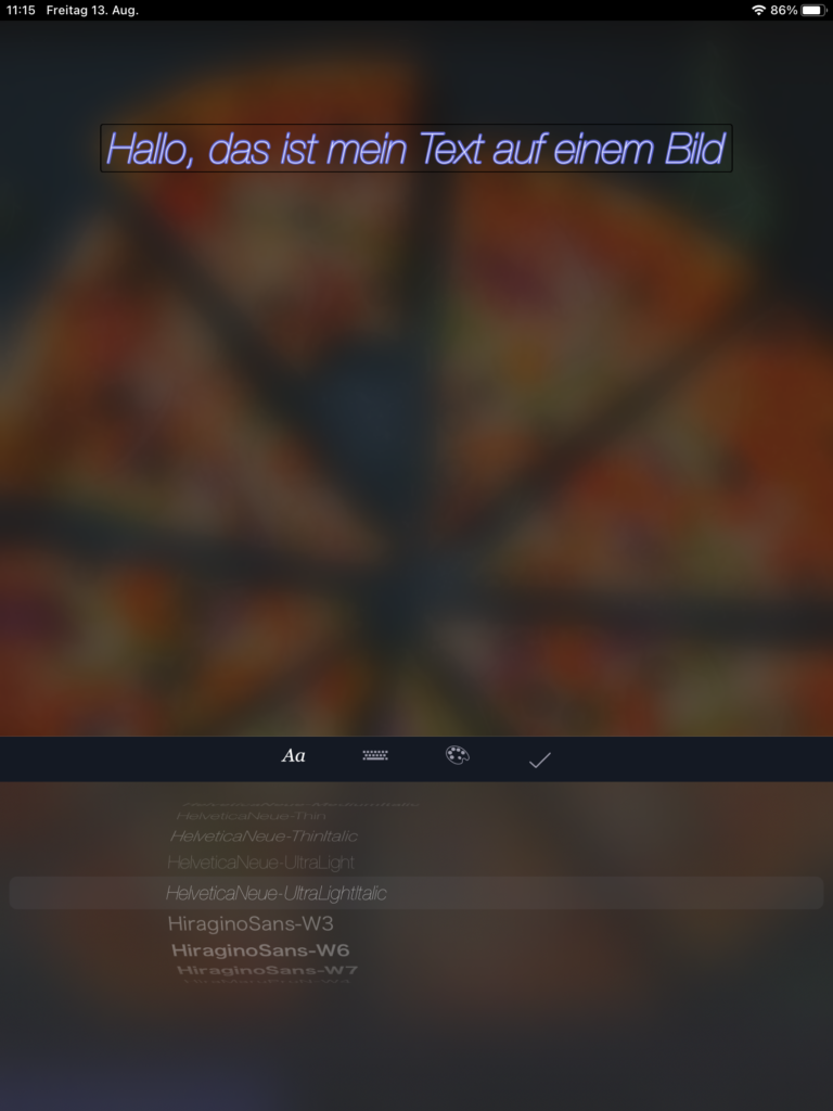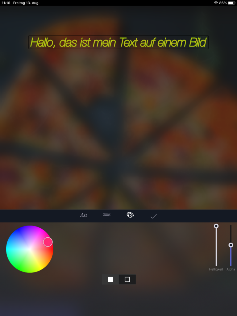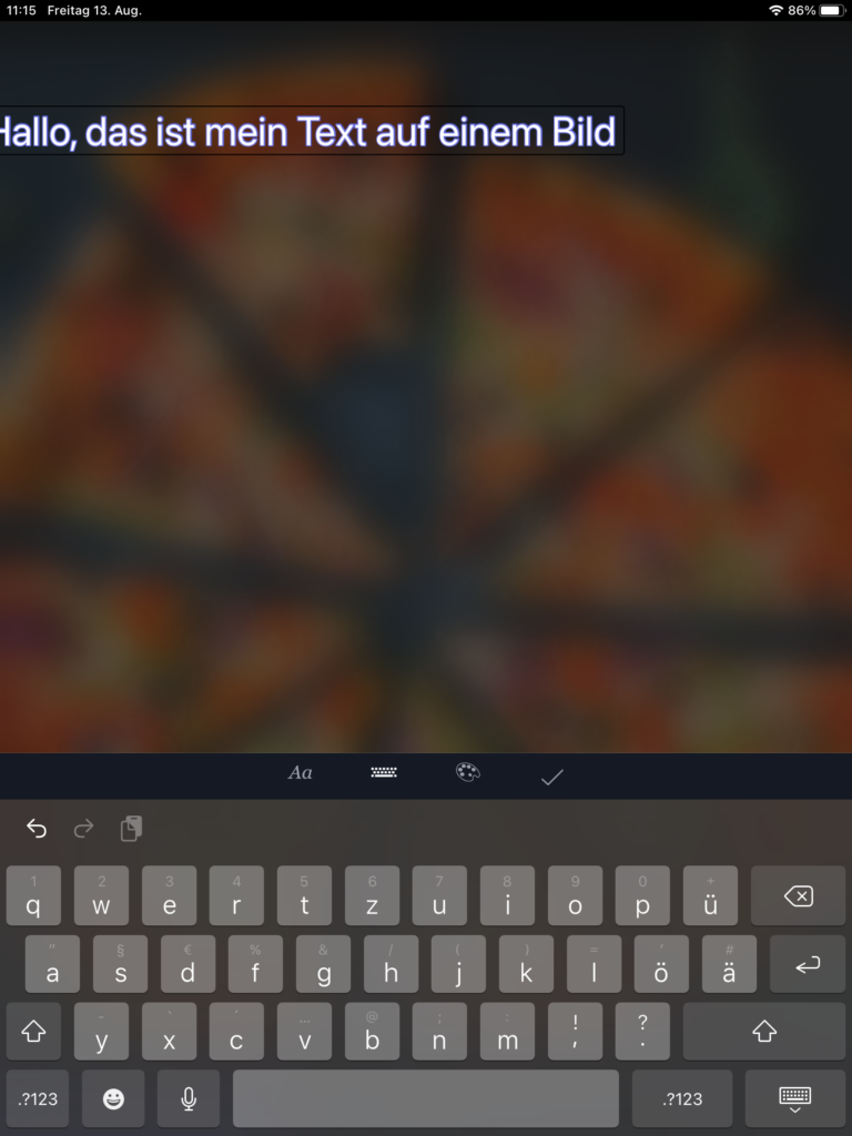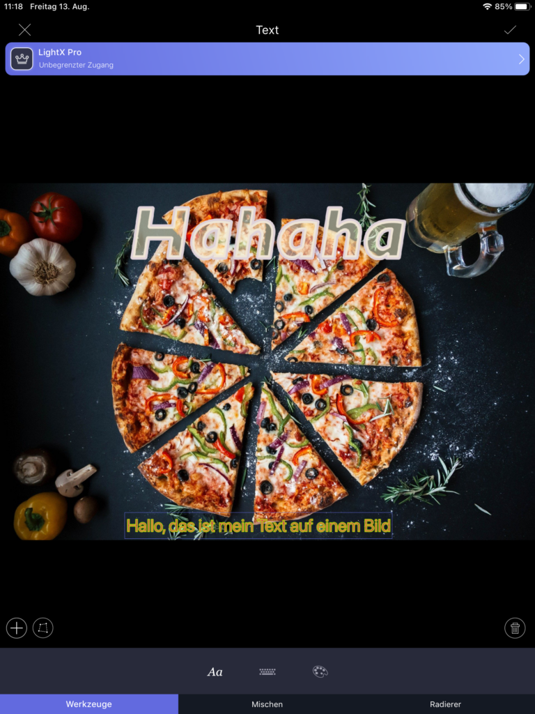 Mit einem Klick auf «Text» kannst du zu deinem Bild einen beliebigen Text hinzufügen. Klicke dazu auf die gewünschte Stelle und ein Beispieltext erscheint. Diesen kannst du nun individuell anpassen und verändern.