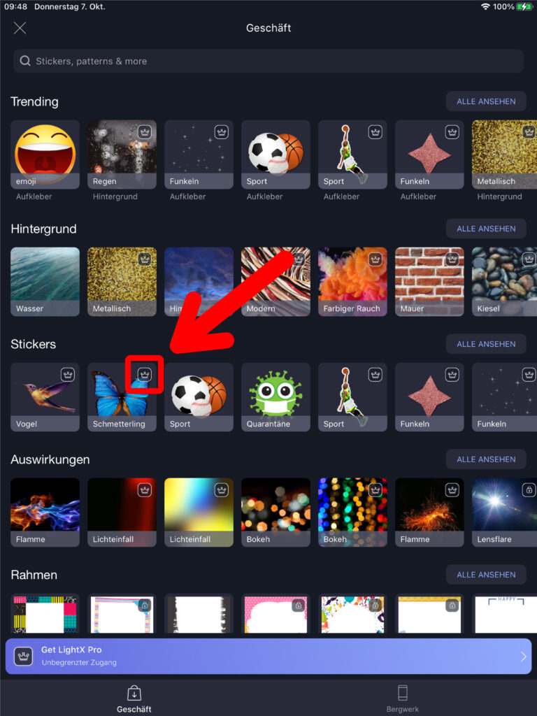 Achtung: Achte auf die kleine Krone bei den jeweiligen Kategorien. Diese steht für die Premium Version. Da auf dem iPad nur die Gratis-Version installiert ist, kannst du nur auf die Elemente zugreifen, bei denen keine Krone abgebildet ist.