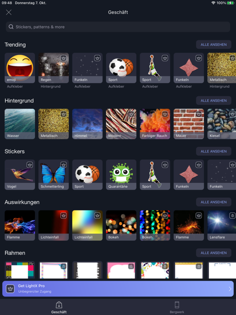 Im Bereich «Geschäft» kannst du Aufkleber, Hintergründe, Sticker, Effekte usw. auswählen, die du über dem Bild beliebig platzieren kannst.