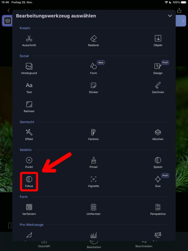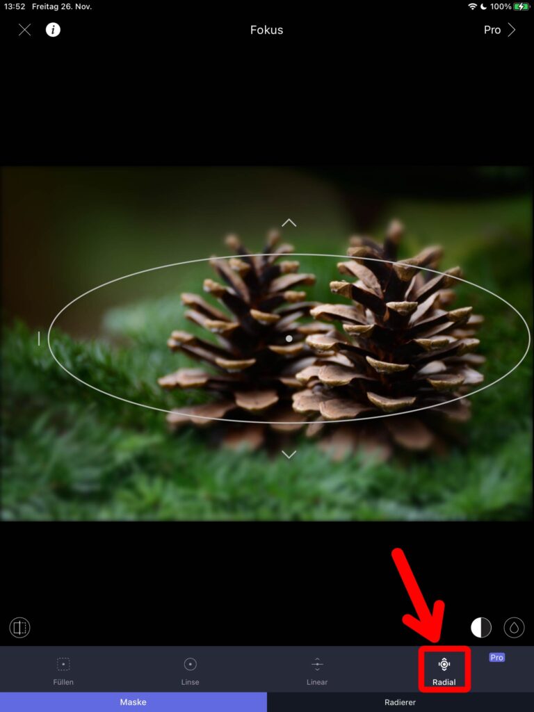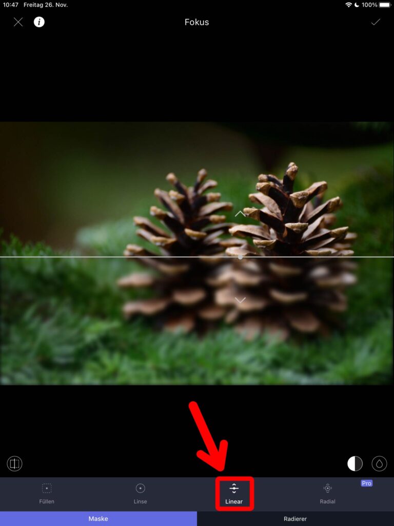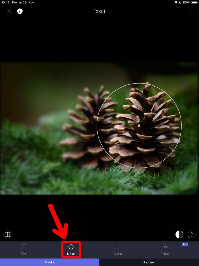 Mit der «Fokus»-Funktion kann einem Foto einen Tiefenschärfeneffekt hinzugefügt werden. Im Bereich «Maske» kann mit der Linse ein bestimmter gerundeter Bereich scharf gestellt werden. Über einen Klick auf «Linear» kann das Bild in zwei Schärfebereiche geteilt werden. Mit dem Radialen Kreis kann ein beliebig runder Bereich scharf gestellt werden. Durch «Smart-Löschen» kann ein Bereich von Hand wieder scharfgestellt werden.