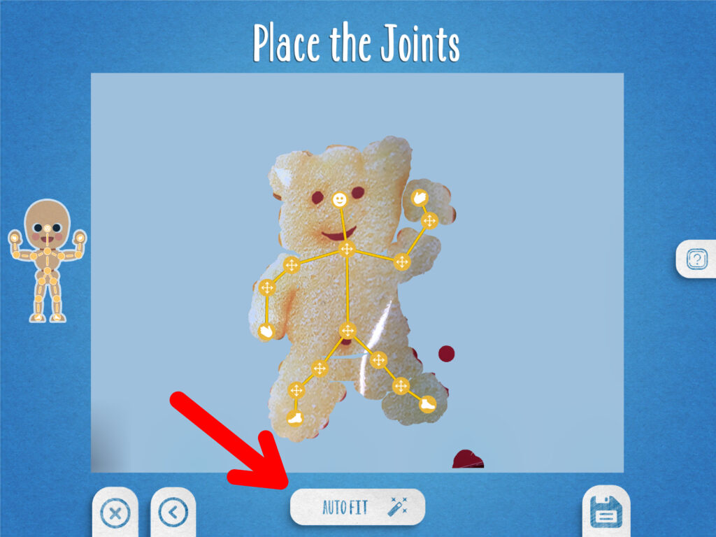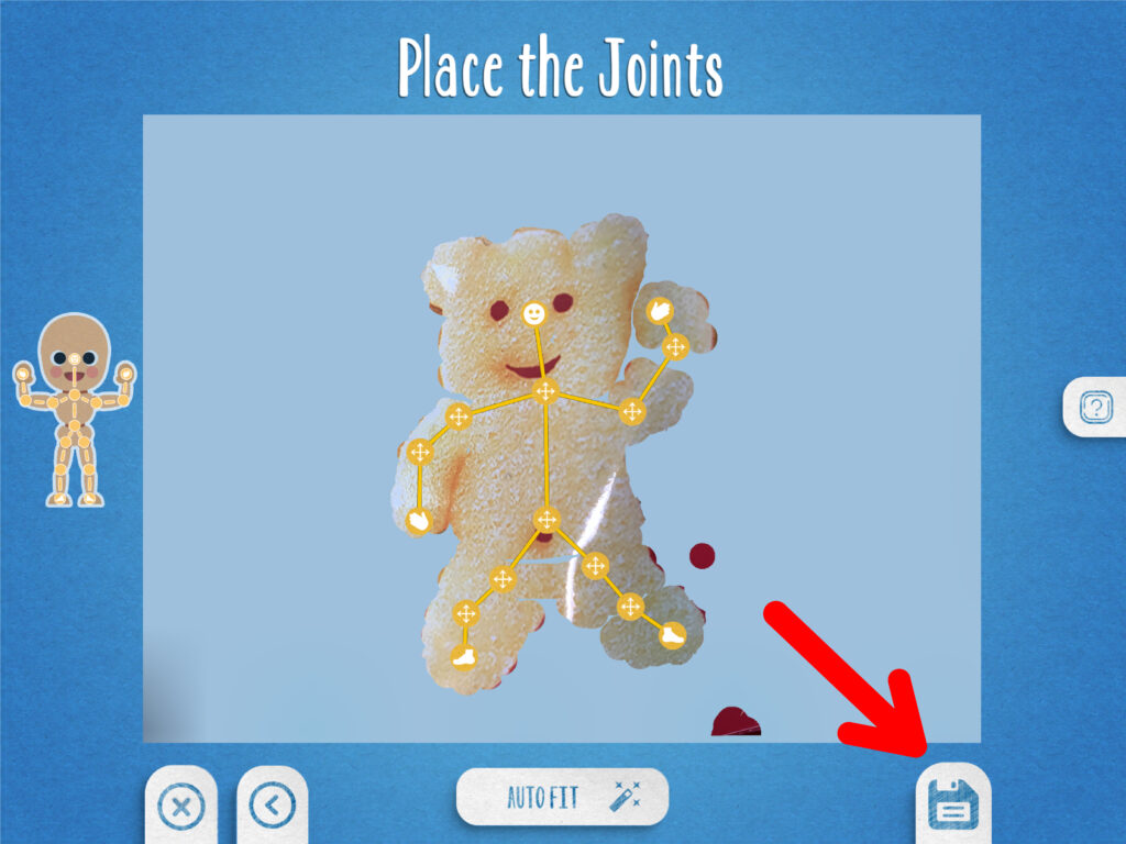 Wenn alle Körperteile markiert sind, musst du die Gelenke richtig zuordnen. Hierfür musst du die Ankerpunkte an der richtigen Stellen platzieren. Hast du alle Körperteile und Ankerpunkte richtig markiert, so kannst du deine Figur abspeichern. Dazu klickst du unten rechts auf das Symbol mit der Diskette.