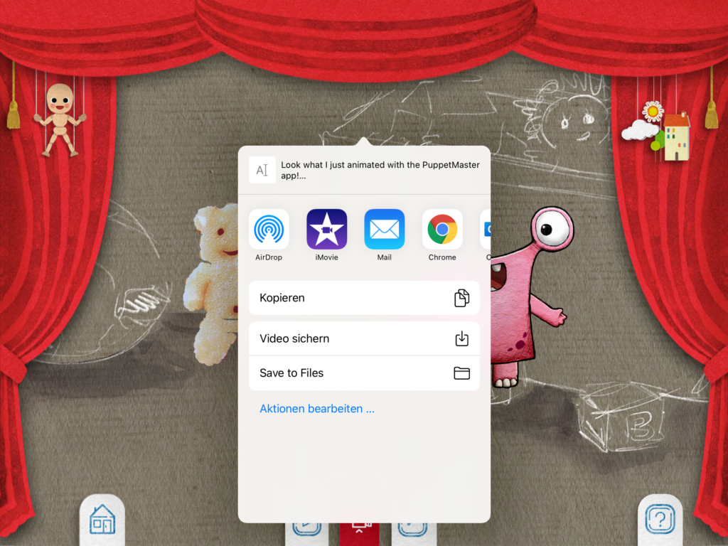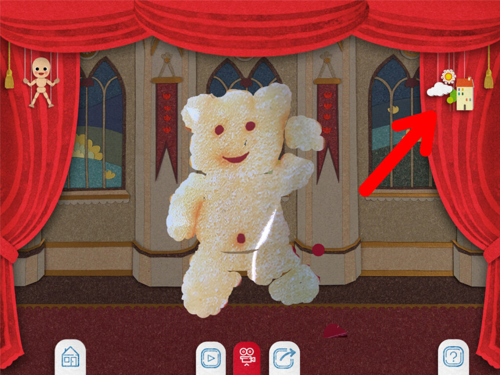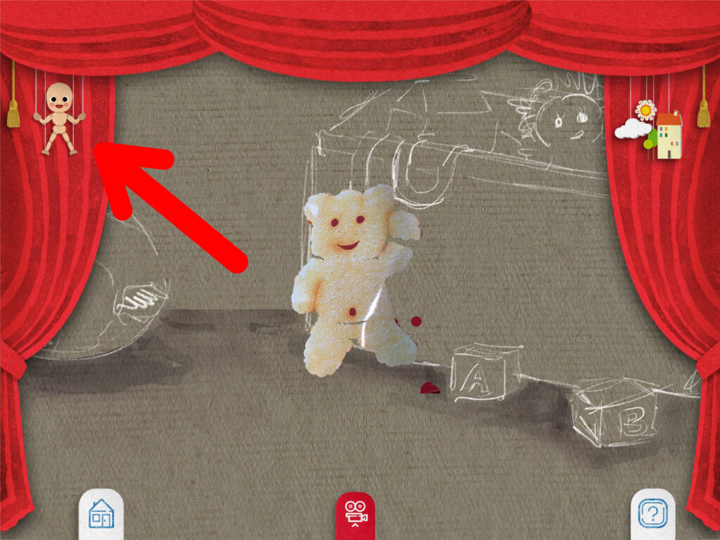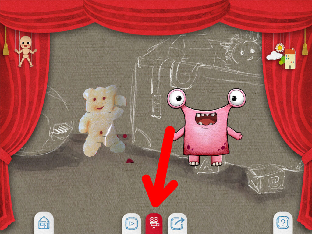 Sind die Figuren bereit für das Theaterspiel (die Aufnahme), so klickst du unten das mittlere rote Symbol mit der Kamera an.