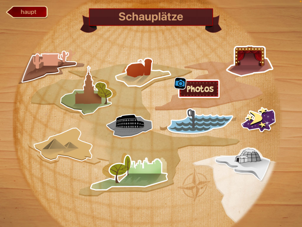 Klicke nach dem Öffnen der App auf die Schaltfläche «Spielen». Nun können verschiedene Schauplätze ausgewählt werden. Wähle einen Schauplatz aus, der zu deiner Geschichte oder zu deinem Thema passt. Der ausgewählte Schauplatz öffnet sich. Nun kannst du dich kreativ austoben.