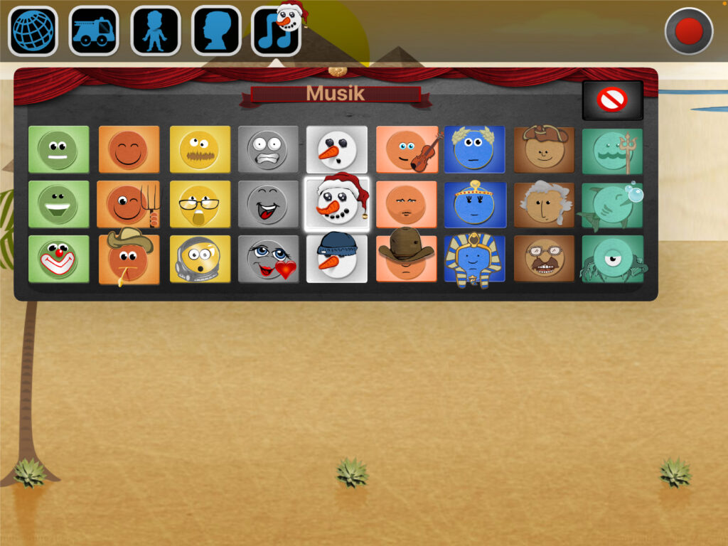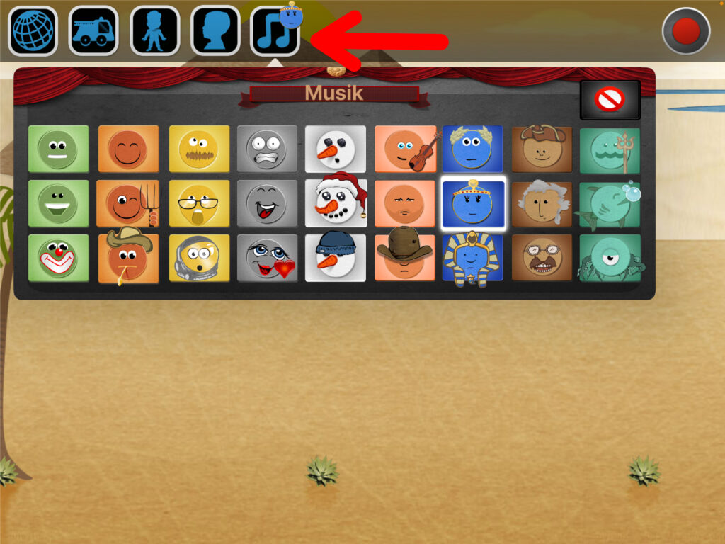 Beim Abschnitt Musik kann man Musik auswählen, die während dem Aufnehmen des Videos abgespielt werden soll. Zu jedem Thema gibt es je drei verschiedene Lieder. Über die Schaltfläche mit der Verbotstafel oben rechts kann die Musik auch komplett ausgeschaltet werden.