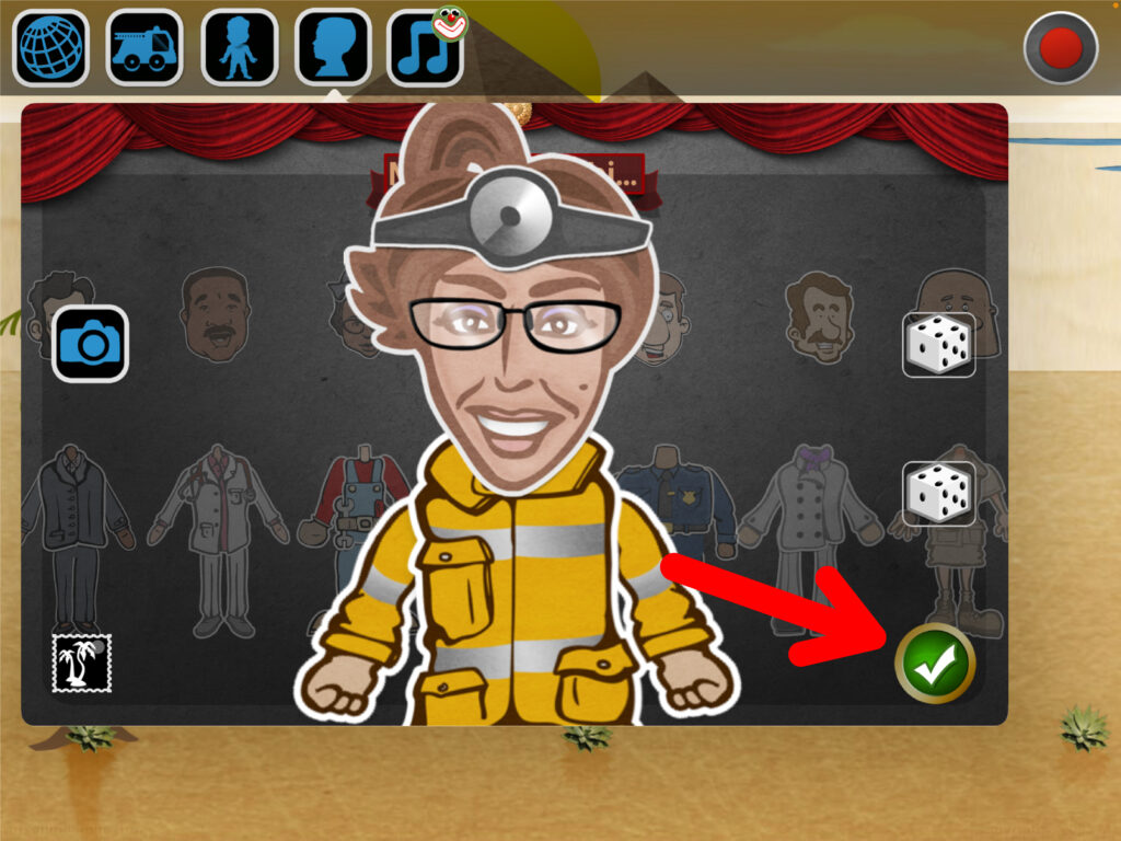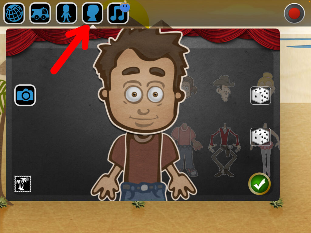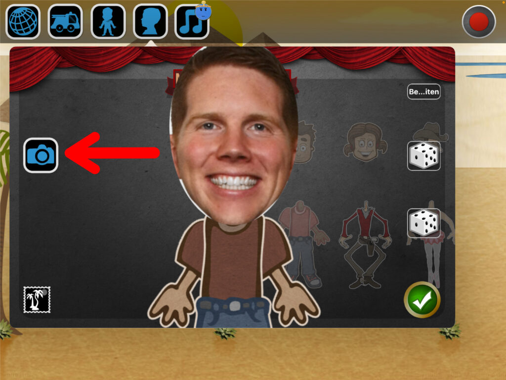 Mit einem Klick auf die Würfel wird eine durch Zufall gewählte Figur erstellt. Mit einem Klick auf den weissen Haken unten rechts bestätigt man die ausgewählte Figur und sie wird in die ausgewählte Szene eingefügt.