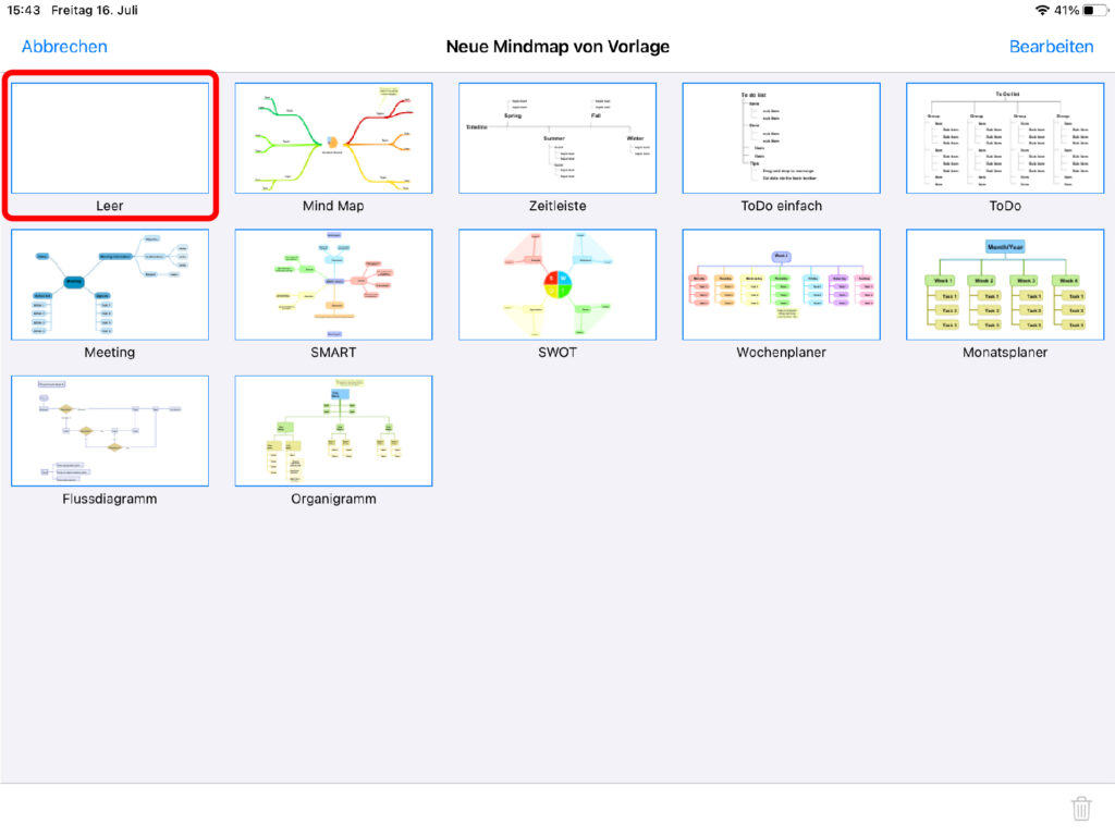 Klicke in der Taskleiste auf «Erstellen» und danach auf das «Stift-Symbol». Wähle «Neue Mind Map» aus, wenn du ein eigenes Mindmap erstellen möchtest. In einem nächsten Schritt kannst du aus den verschiedenen Vorlagen das gewünschte Layout auswählen oder mit einem leeren Mindmap starten.