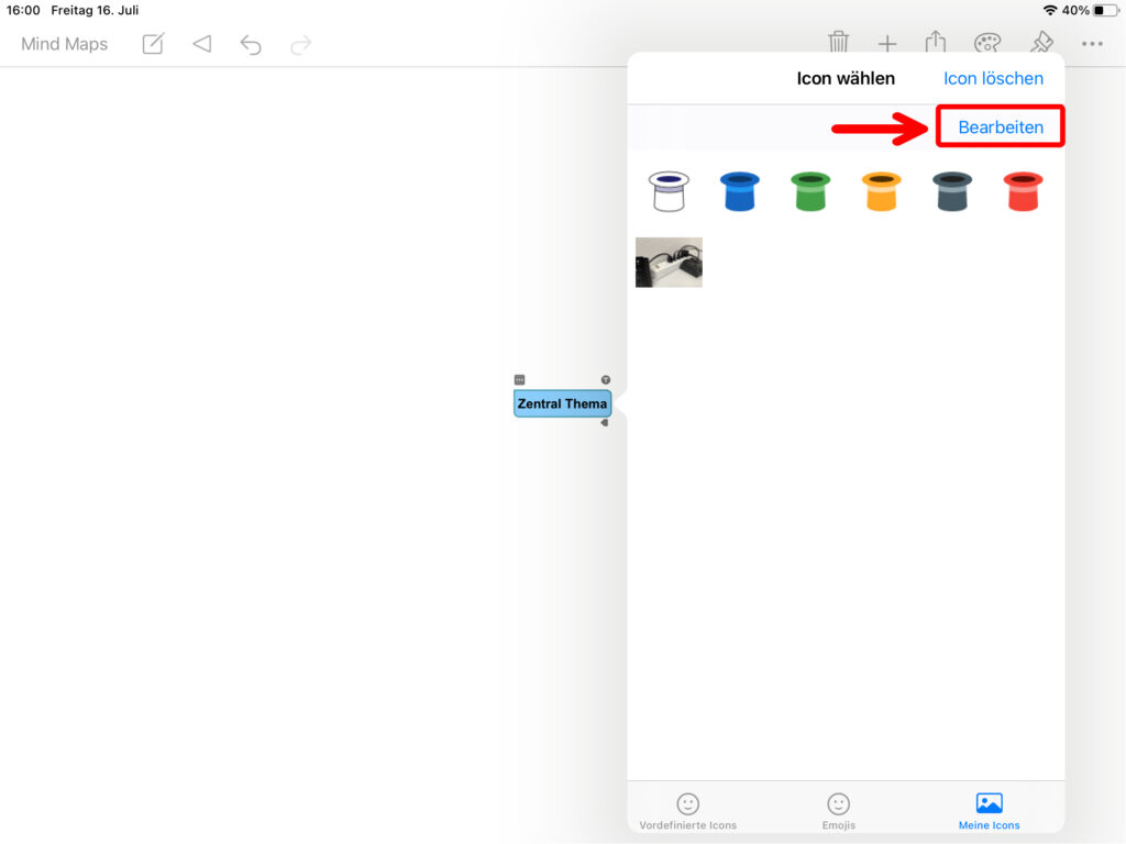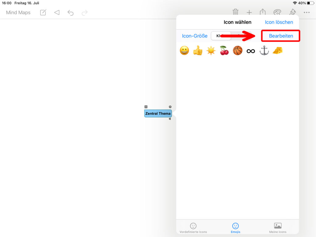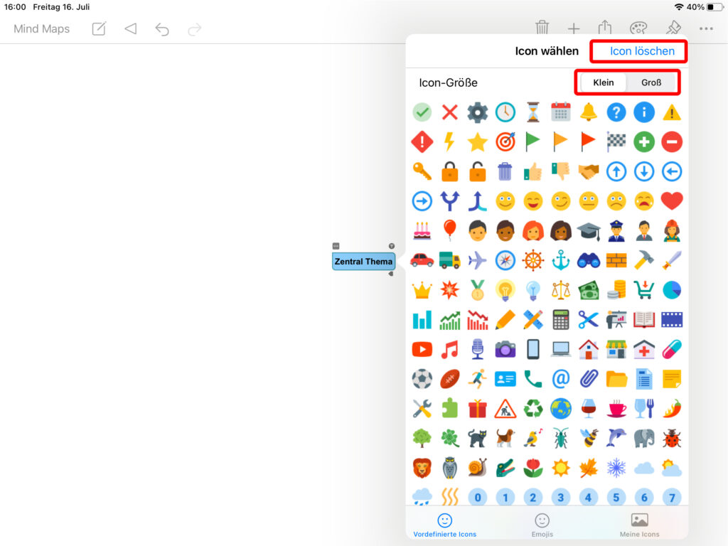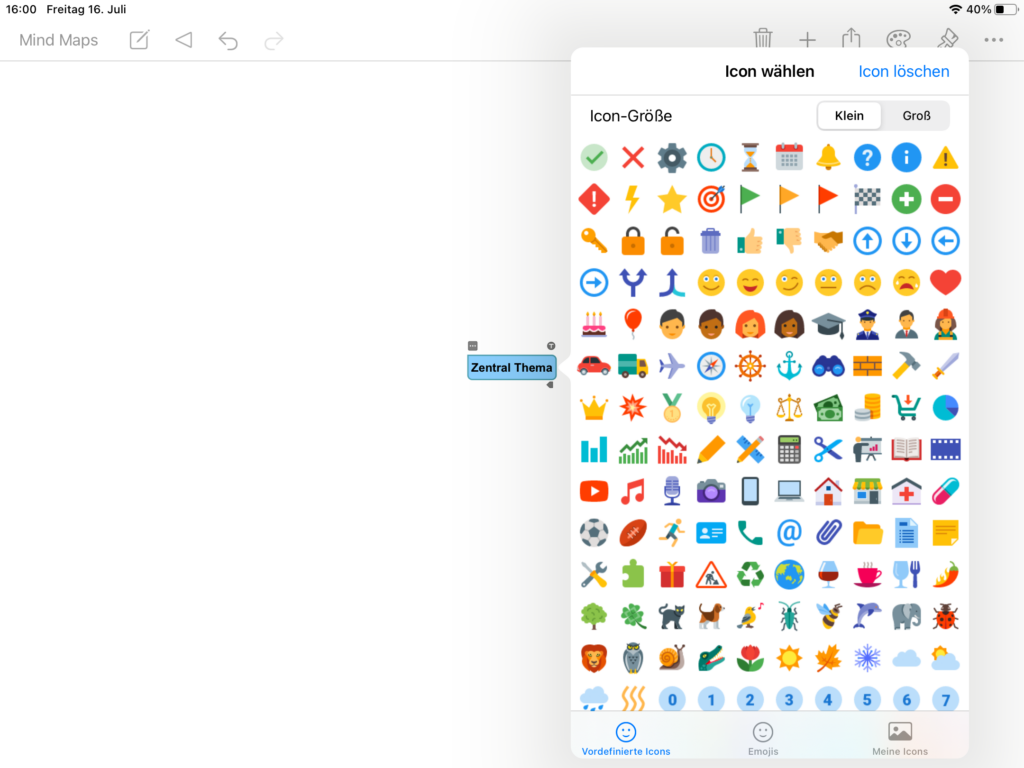 Um in deinem Mindmap nun ein eigenes Icon einzufügen, musst du es in der Übersicht auswählen. Du kannst zwischen den Icon-Grössen «klein» oder «gross» wählen. Das machst du in der Übersicht mit dem Slider «Icon-Grösse». Falls du das Icon später wieder löschen möchtest, so wählst du es aus, öffnest die Icon-Übersicht und klickst anschliessend oben rechts auf «Icon löschen».