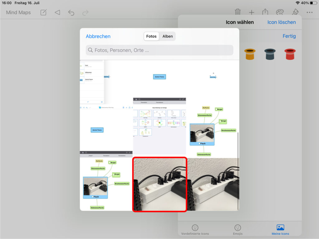 Unter «Meine Icons» kannst du aus Fotos, die du mit der Kamera des iPads aufgenommen hast, sogar eigene Icons erstellen. Klicke dazu wieder auf das Pluszeichen und wähle im neuen Fenster dein gewünschtes Foto aus. Wenn du es angetippt hast, wird es automatisch der Auswahl hinzugefügt.